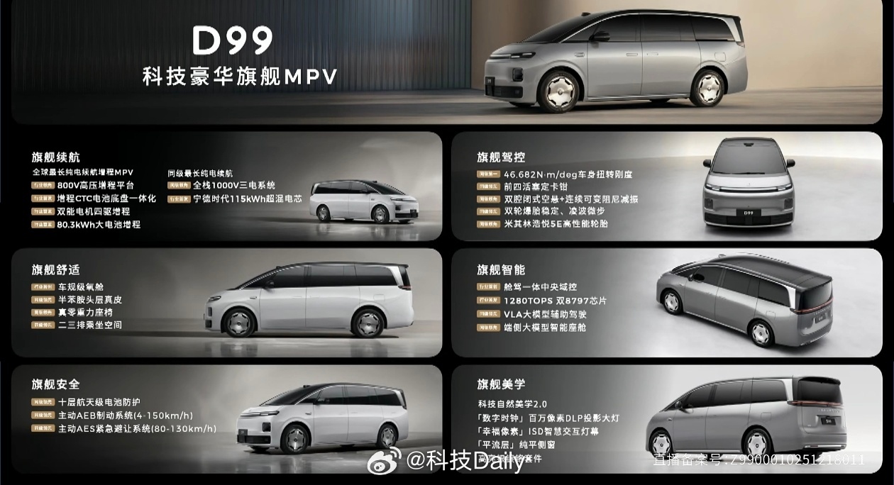 零跑D99来了,初见的感觉是好可爱。好看,好开,好坐,好安全,零跑实在!移动头等舱,目标很清晰,流线型设计,颜值拿捏,空间拿捏。超5.2米车长,超2米车宽,超3.1米的轴距,主动进气格栅兼顾功能性。平流层侧窗,有特色,更敞亮,咱就是这设计,还得是零跑来定义。巨幕天窗,真敞亮,各方面考虑都很周到,五款颜色最喜欢哪个?大气,又有辨识度,这很零跑。旗舰增程打造全球最长纯电续航增程MPV,旗舰千伏纯电 同级最长纯电续航,顶级旗舰智能,心动不心动。零跑汽车十周年零跑9系豪华双旗舰同台首秀