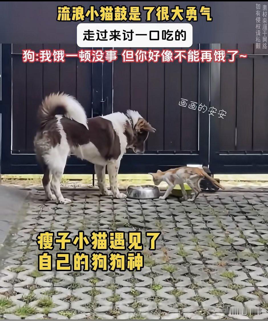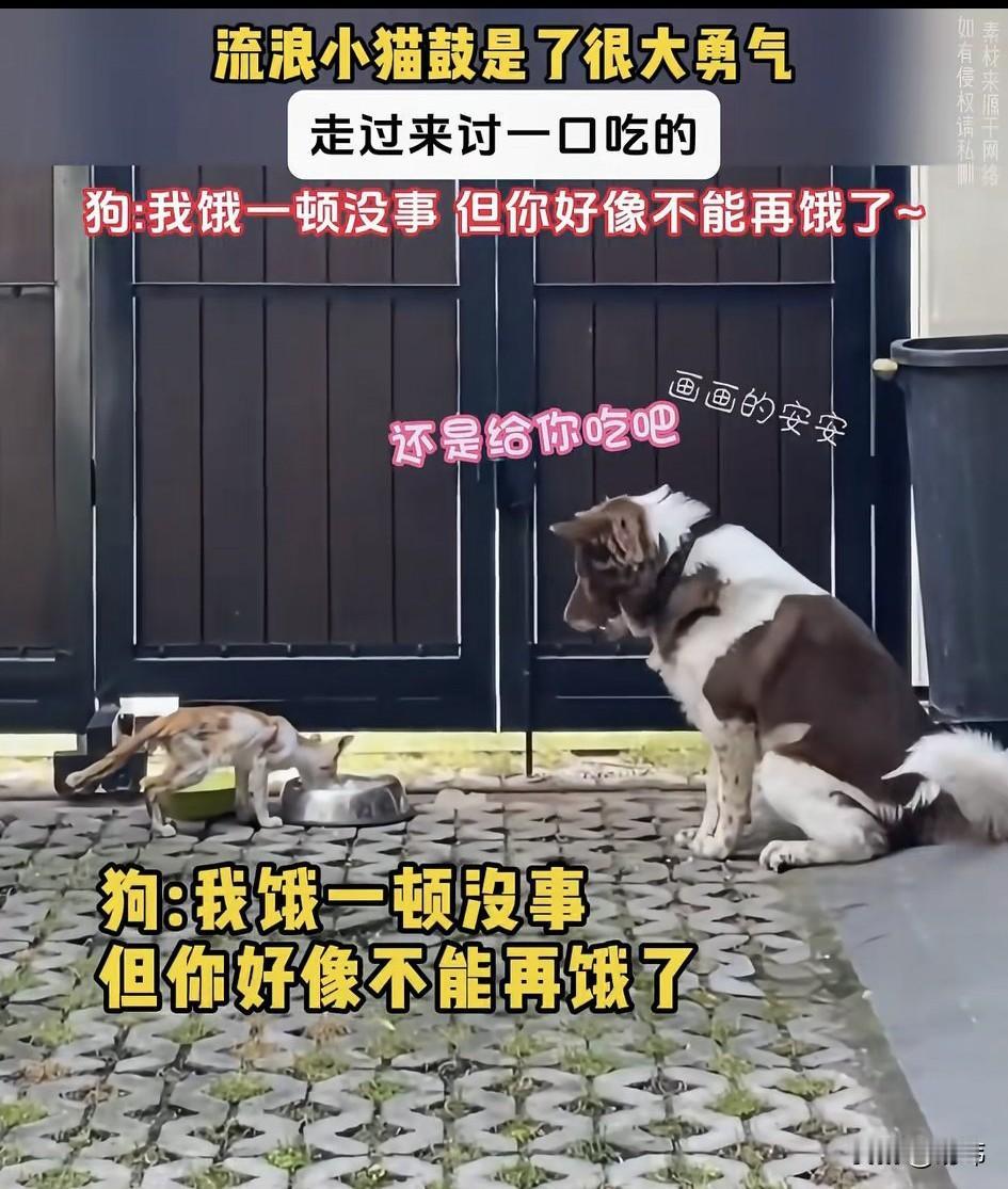 泪目了!一只流浪小猫很小的时候就开始流浪,而因为个子小根本找不到什么食物,所以它饿的皮包骨,非常虚弱。这天它来到一户人家门口,看到那户人家的狗狗有一个饭盆的食物。 它实在太饿了,很想上前去讨口吃的,可又担心被狗狗咬,又后退了两步,它看看狗狗,发现它没有反应,又看看饭盆于是鼓足勇气上前去吃,而狗狗看到它瘦骨嶙峋的样子觉得自己饿一顿没事,它已经不能再饿了,于是就后腿两步蹲在那里看着它吃。 小猫终于心满意足的美食了一顿,它很开心,不停地朝狗狗喵喵叫,估计是在感谢它,而这感人的一幕都被狗狗的主人看在了眼里,小姐姐当即就决定收养这只可怜的小猫,从此狗狗和小猫都过上了幸福的生活。