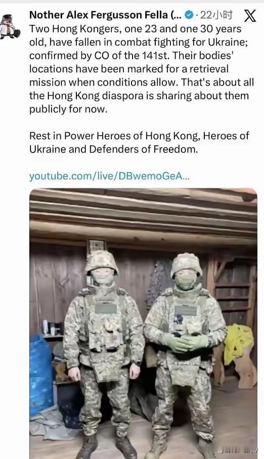 以为玩游戏呢? 俄乌战争都白热化了,这俩香港青年还去凑热闹! 结果不到一个月,就客死他乡。 太可惜了! 一个23,一个30,风华正茂的年华,说没就没了。 典型的藕粉。 据说,这两个香港籍志愿者不简单: 一个是攀岩教练,一个是保镖,练家子出身。 自恃一身功夫,想跟大鹅较量一下。 没想到出师未捷身先死! 据乌媒报道,这俩货来到乌克兰还没正式培训,就被送上前线。 毫无作战经验的他们,一上场就遭遇不幸,被炸身亡。 为理想而死,死而无憾! 乌高 官称他俩是“香港的英雄,乌克兰的英雄,自 由的捍卫者!” 受到如此殊荣足矣! 这俩香港志愿者出名了… 至少在乌克兰可以树碑立传啦! 俄乌冲突