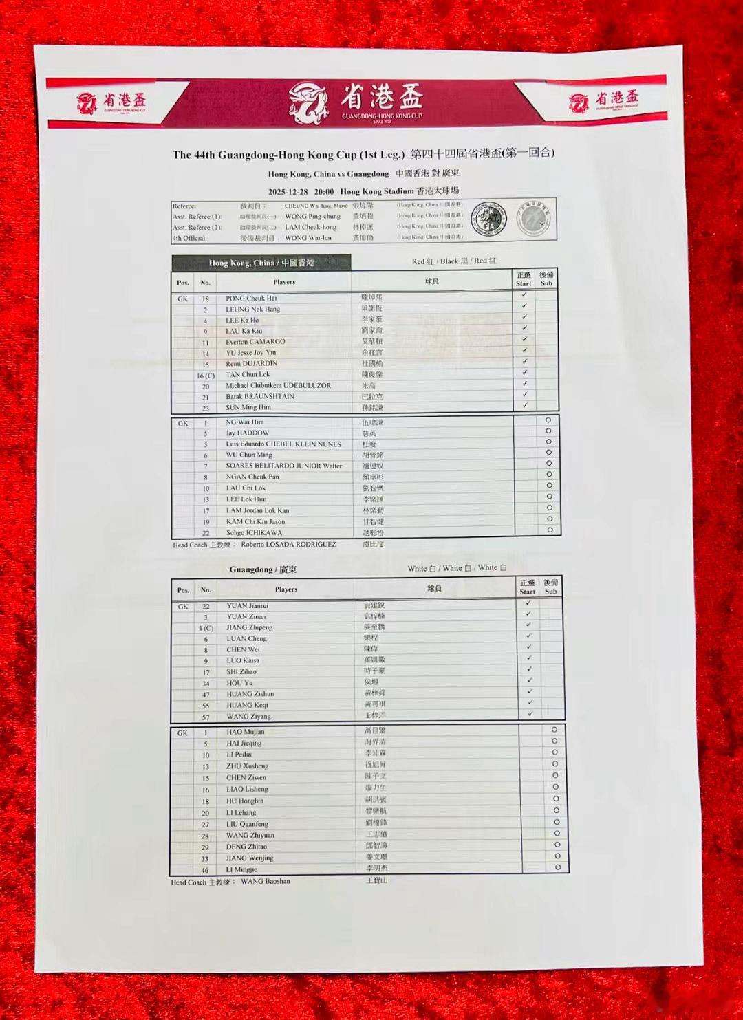 省港杯 今晚,第44届省港杯第一回合在香港大球场进行,来自深圳新鹏城队的“小将”姜至鹏担任广东省队队长,身披4号战袍首发出战。来自广州豹的侯煜身披34号球衣首发。廖力生在替补名单里。省队加油!深圳新鹏城