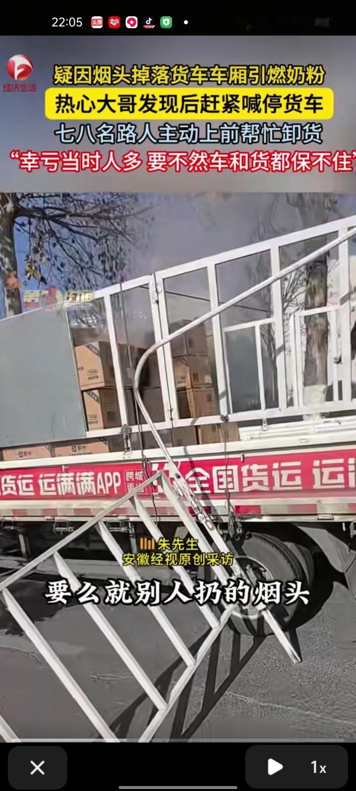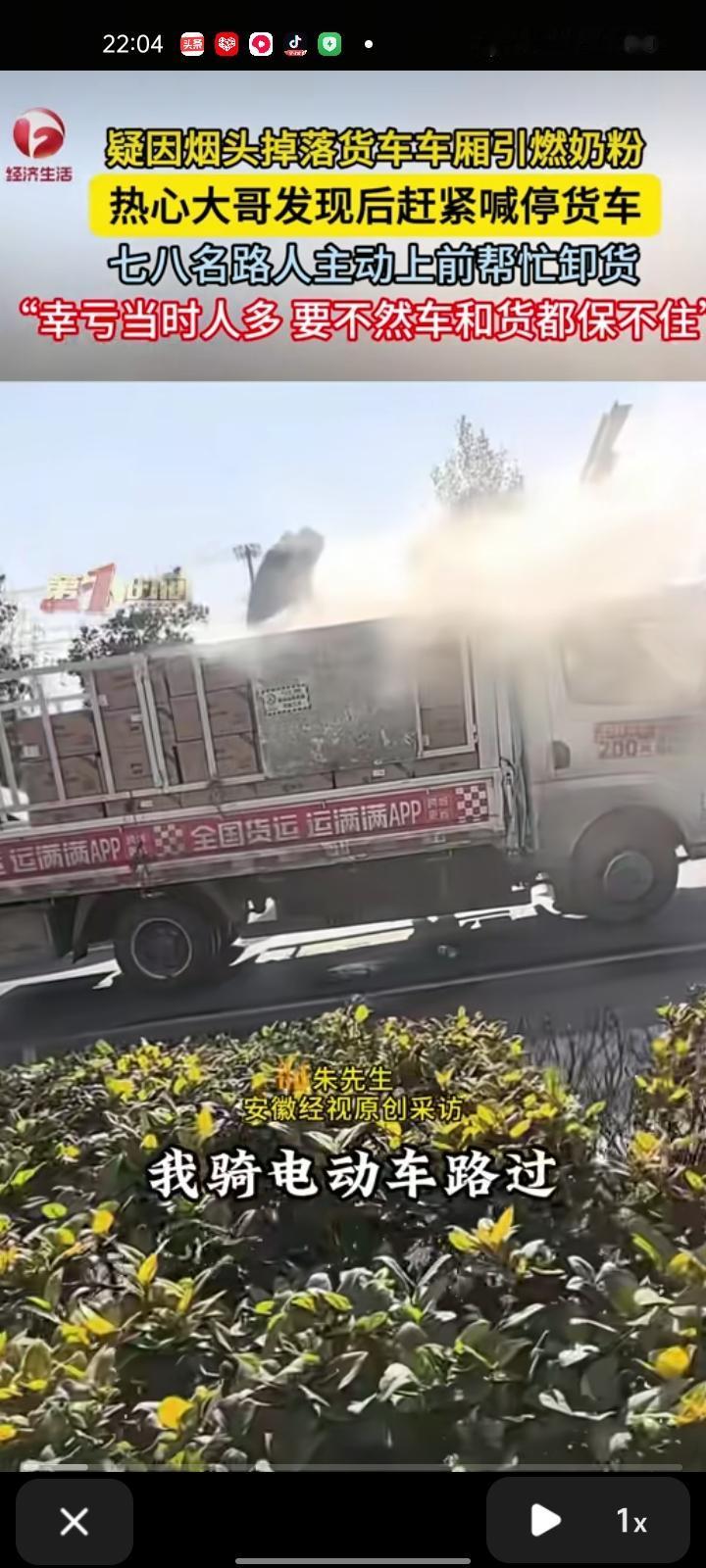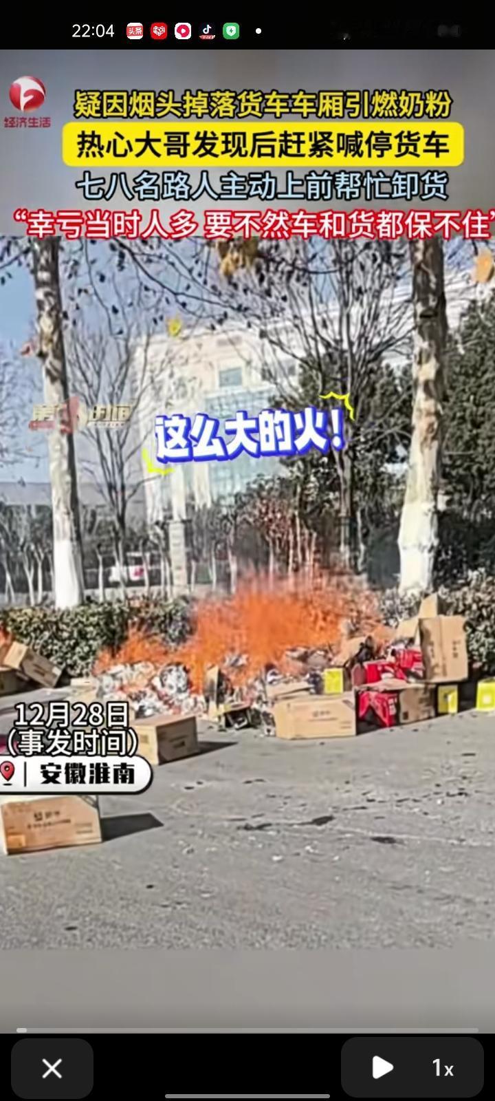 12月28日,安徽淮南。一男子骑车路过发现货车车厢引燃奶粉,可能是别人扔烟头刮过去的,于是叫司机到旁边停车,然后把货卸掉,再晚点整个车都着火了,七八人都过来帮忙了。幸好人多力量大,不然车和货都保不住了。