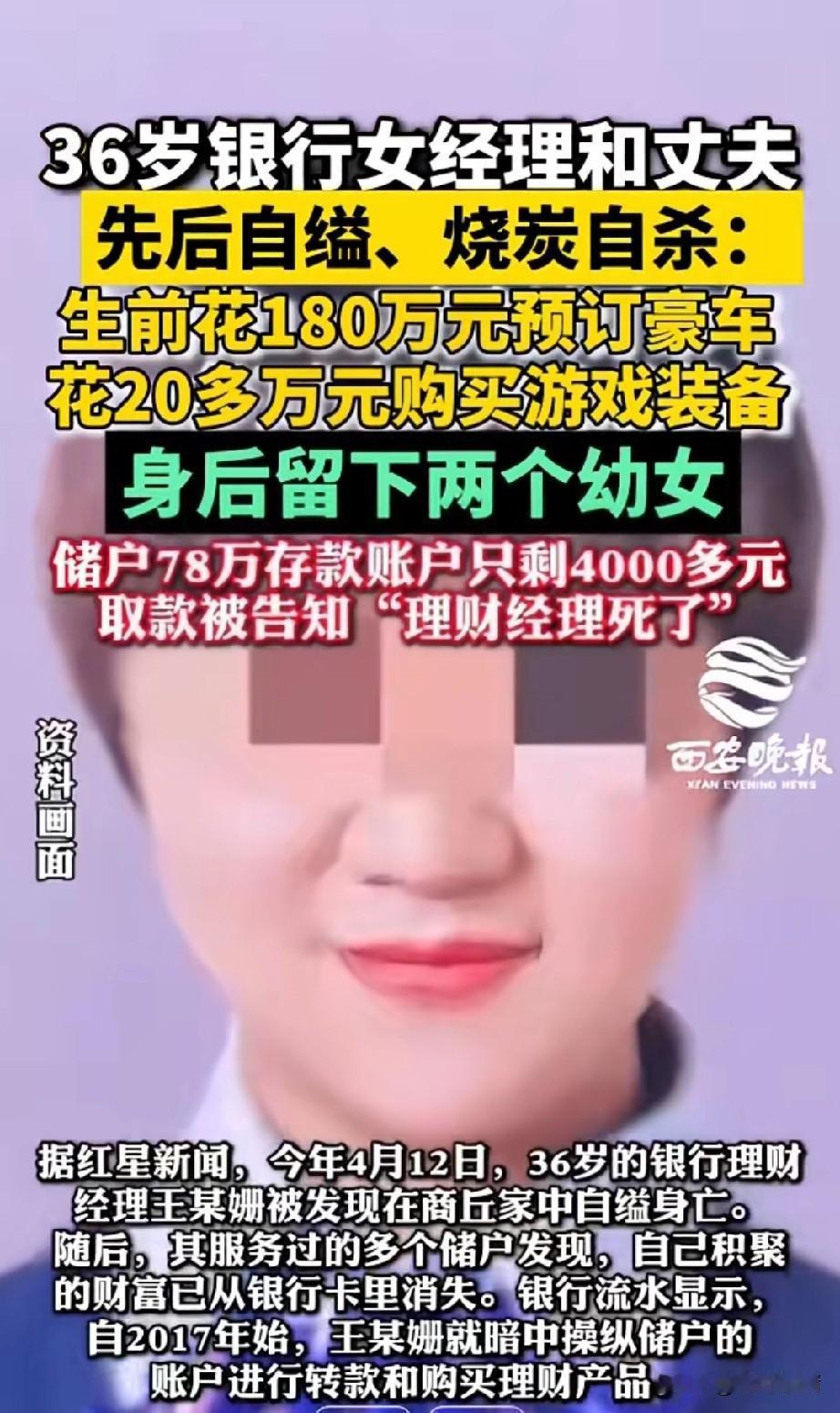 36岁的理财经理和丈夫先后自缢、烧炭自杀,她服务过的多名储户这才发现自己银行卡中的钱不翼而飞了。 据了解王某珊是商丘永城人,她的父亲是国企退休员工,她的母亲在银行系统工作,家庭条件优优渥! 谁也想不到她会以这样的形式结束自己的生命,同事眼中的她努力而上进,又有大把的储户资源! 被她服务的储户眼中,她是一个热情的银行工作人员,对她们理财非常上心,就能给她们带来很多收益,因此很多储户才放心的把钱交给她! 闺蜜眼中的她,是月薪五六万,为人豪爽大气的好朋友,有事儿总能找到关系帮她! 就是这样一个看似人畜无害的理财经理,却对自己储户的钱动了歪心思,从2017年开始 ,王某珊最开始将储户的钱私自划扣到自己的账户,开始了各种投资理财! 刚开始的她确实赚了不少,可是后来我赔了钱,导致窟窿越来越大了,她就更加开始肆无忌惮挪用储户的钱。 自杀前还用储户的钱180万定了豪车,她老公还花20多万买了游戏装备,直到一名存户78万被她花的只剩4000元,取款时发现钱没了,自己的理财经理也死了,这个惊天秘密才浮现在眼前。 人就是有这样的弱点,一旦体验过金钱的快乐,就犹如打开了潘多拉魔盒,一发不可消息,总觉得凭借自己可以赚的更多,结果却越陷越深! 大家对于商丘银行理财经理私自挪用客户存款这事怎么看? 去银行取钱,银行不给怎么办 商丘身边事 取款悲剧 储户取钱死亡