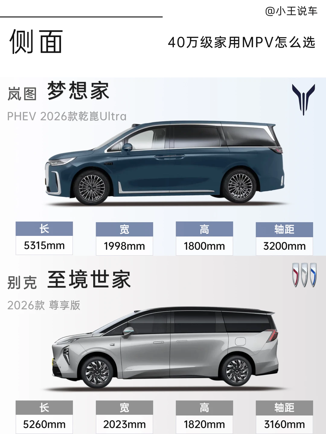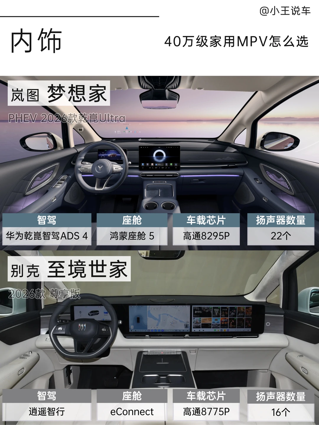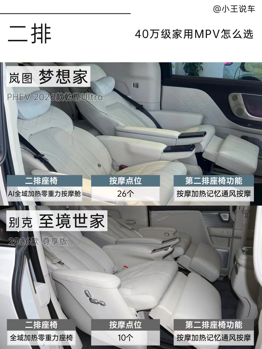 选MPV必须考虑到全家人的乘坐体验,配置要够顶、二排要够舒适、还要钱划算,该怎么选?🌟这期小王对比了岚图梦想家乾崑Ultra和别克至境世家尊享版,看完你就知道该怎么选了