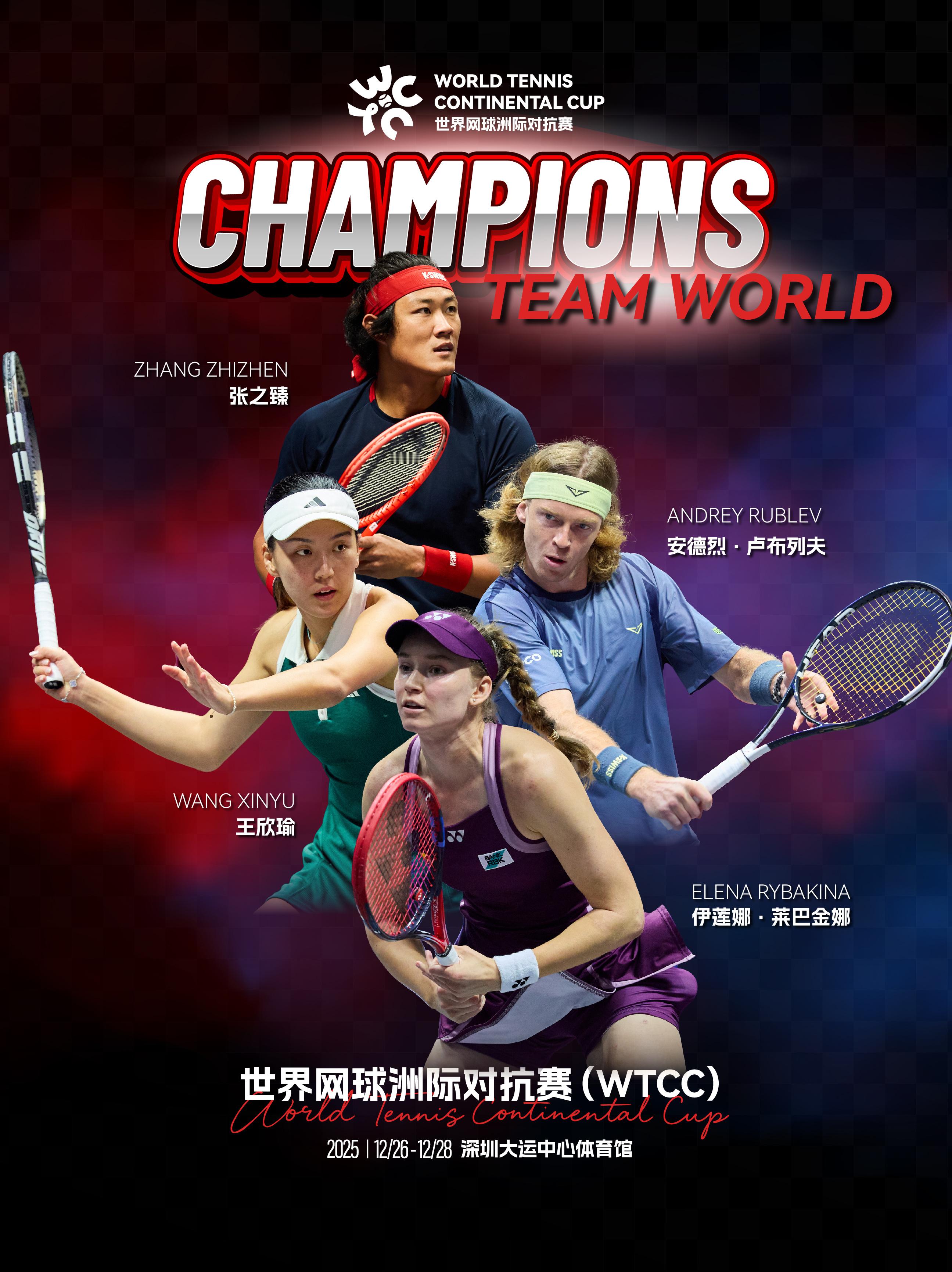 wtcc世界网球洲际对抗赛 卢布列夫成世界队最大功臣💪S5赛段男单对决压轴上演,世界队卢布列夫以6-3/6-4战胜欧洲队科博利,本届赛事三战全胜、独得八分,成为世界队夺冠的最大功臣!🏆2025世界网球洲际对抗赛(WTCC)冠军:🔴世界队莱巴金娜(Elena Rybakina)卢布列夫(Andrey Rublev)王欣瑜(Wang Xinyu)张之臻(Zhang Zhizhen)我的2025belike体育大赏网球