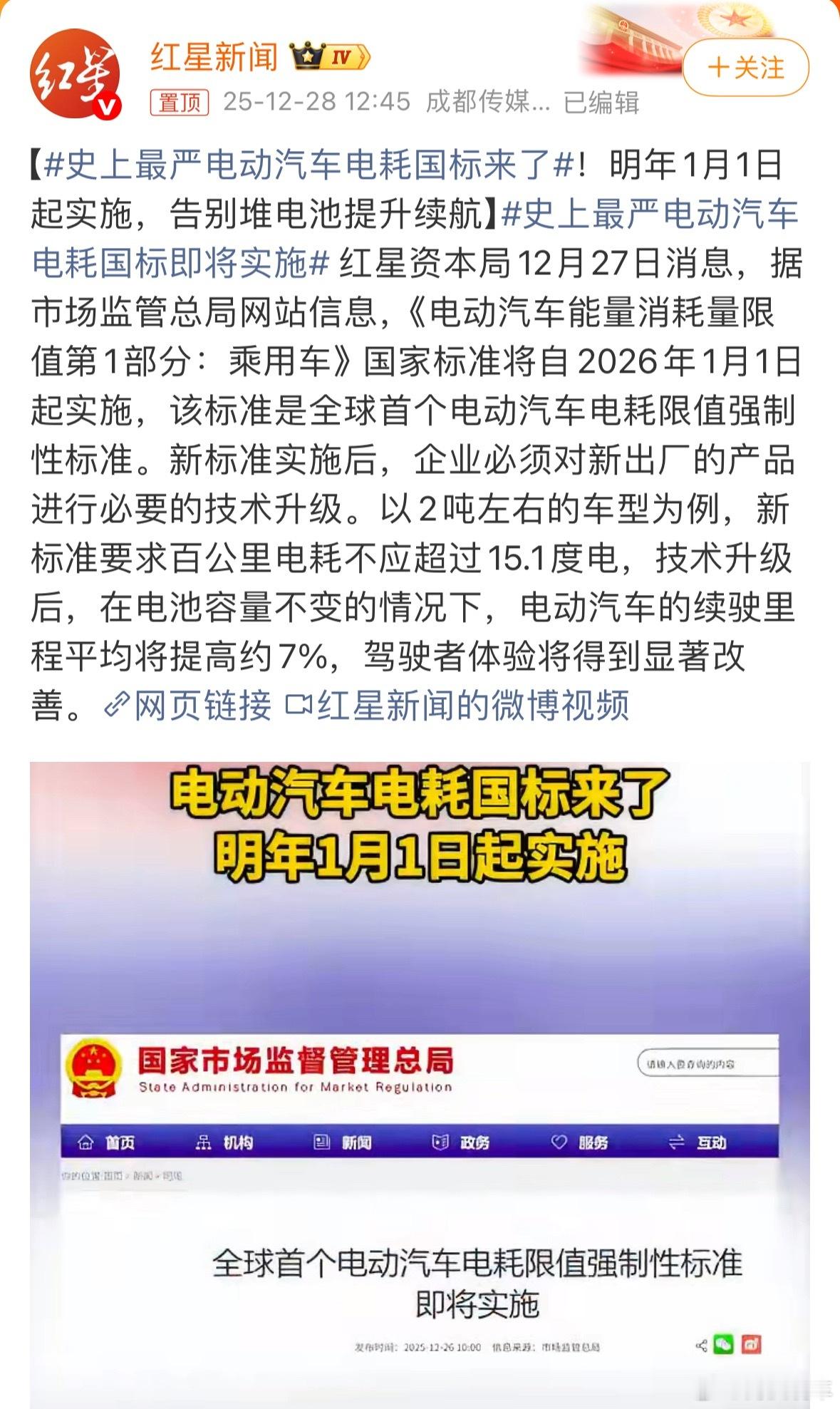 史上最严电动汽车电耗国标来了 新能源行业确实还有很多乱象,像之前的“零公里二手车”、“夸大其词式的宣传”。电池的续航和能耗是各家宣传的重点之一。于是“续航虚标”问题就来了,这就让一些本来是为了续航和能耗购买的用户大失所望。这下好了,有了相关的规定出台以后,如果新车下线不达标准,直接就不让你卖。举例来说:以2吨左右的车型为例,新标准要求百公里电耗不应超过15.1度电,技术升级后,在电池容量不变的情况下,电动汽车的续驶里程平均将提高约7%。一方面倒闭企业搞技术创新,一边也利好消费者。这样也可以提供给更多犹豫买不买电车的消费者一个更清晰的思路。