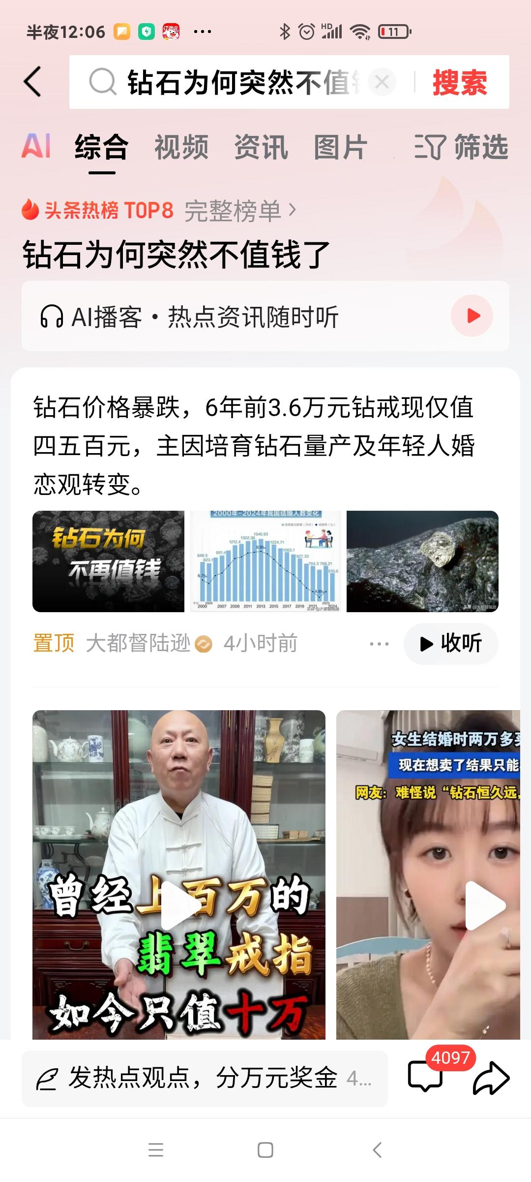 钻石本就不是世界硬通货! 黄金才是硬通货! 之前贵是物以稀为贵,再加上商家会拿爱情当借口宣传!收割情侣! 其实全球早就发现了一些大钻石矿,量很大,只是被几大资本控制了,价格才没有暴跌,不然早跌了! 再加上现在人造钻石技术成熟,物美价廉,对钻石市场也造成一定的影响! 钻石不是突然不值钱了,只是回归它的价值本身而已!