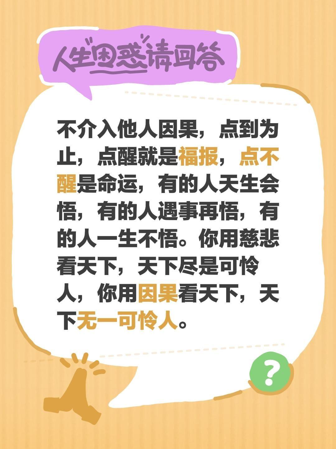 不介入他人因果,点到为止,点醒就是福报,点不醒是命运,有的人天生会悟,有的人遇事再悟,有的人一生不悟。你用慈悲看天下,天下尽是可怜人,你用因果看天下,天下无一可怜人。
