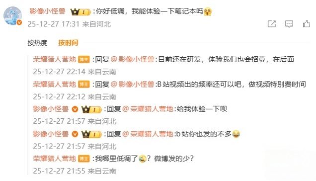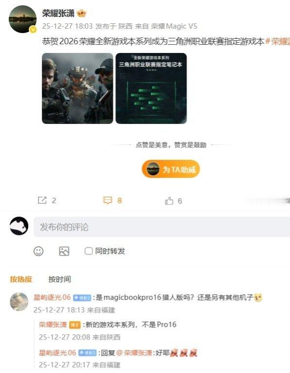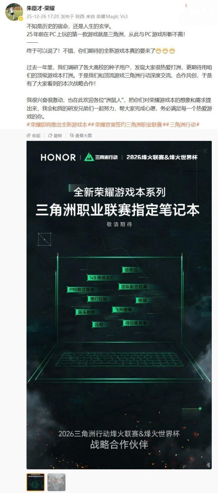 【全新荣耀游戏本系列研发中:非 MagicBook Pro16,预计明年推出】据荣耀终端股份有限公司 PC 产品总经理 朱臣才 分享,荣耀全新游戏本即将发布(具体发布时间暂未公布)。朱臣才分享的预热海报显示,新品也是《三角洲行动》职业联赛指定笔记本。值得一提的是,“荣耀猎人营地”账号昨日在微博发文透露了新品进展:“目前还在研发,体验我们也会招募,在后面。”荣耀终端股份有限公司全场景产品线张潇 还发文确认,全新荣耀游戏本是一个新的游戏本系列,不是 MagicBook Pro16。在 12 月 26 日的荣耀新品发布会上,荣耀官方表示,全新游戏本产品将在明年推出。