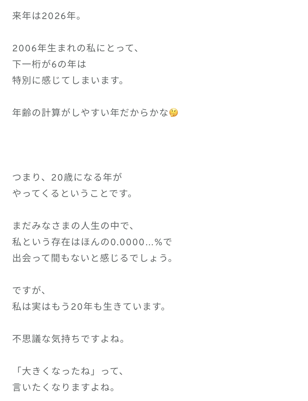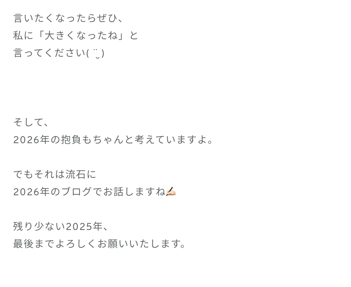 佐藤優羽「2025年が終わりに近づいています。お正月の訪れが楽しみですが、年の瀬はやはり寂しくなるものです。今年はたくさんのことを経験させていただきました( ..)"みなさまと出会えたことも勿論、今年の特大の嬉しかったことです。」