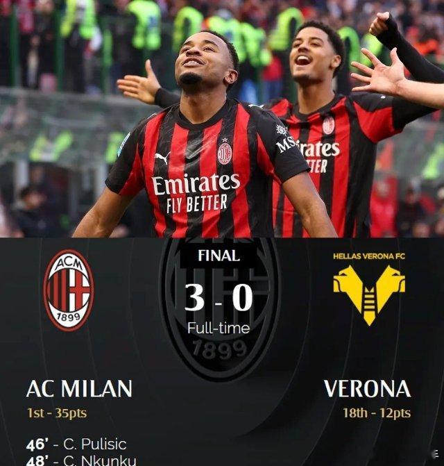 AC米兰3比0维罗纳北京时间12月28日晚,意甲第17轮,AC米兰主场对阵维罗纳。上半场伤停补时,普利希奇接拉比奥头球助攻推射破门。下半场,恩昆库爆发,他在48分钟和53分钟连入两球,完成梅开二度。最终,米兰3-0战胜维罗纳,在多赛一场的情况下暂登意甲积分榜榜首。
