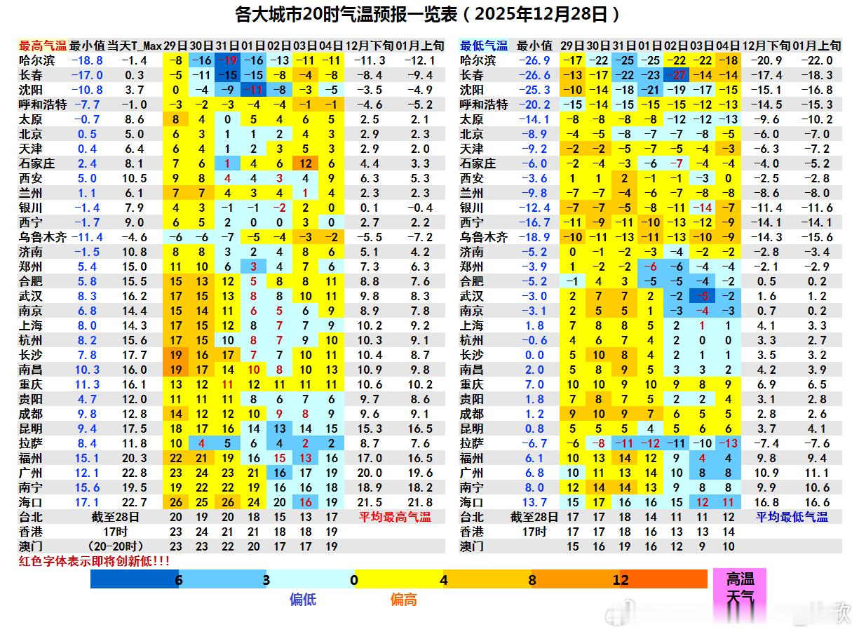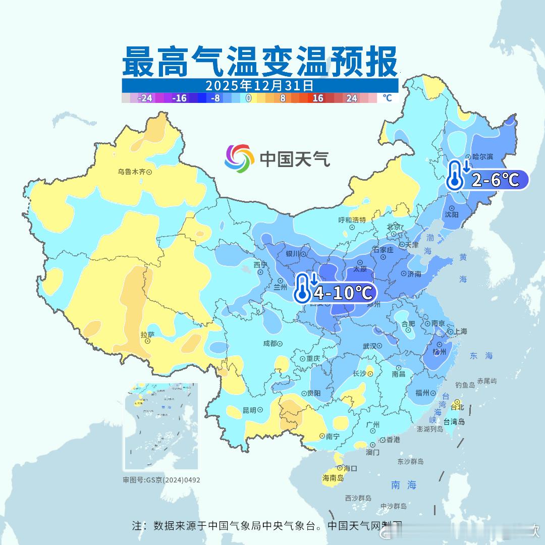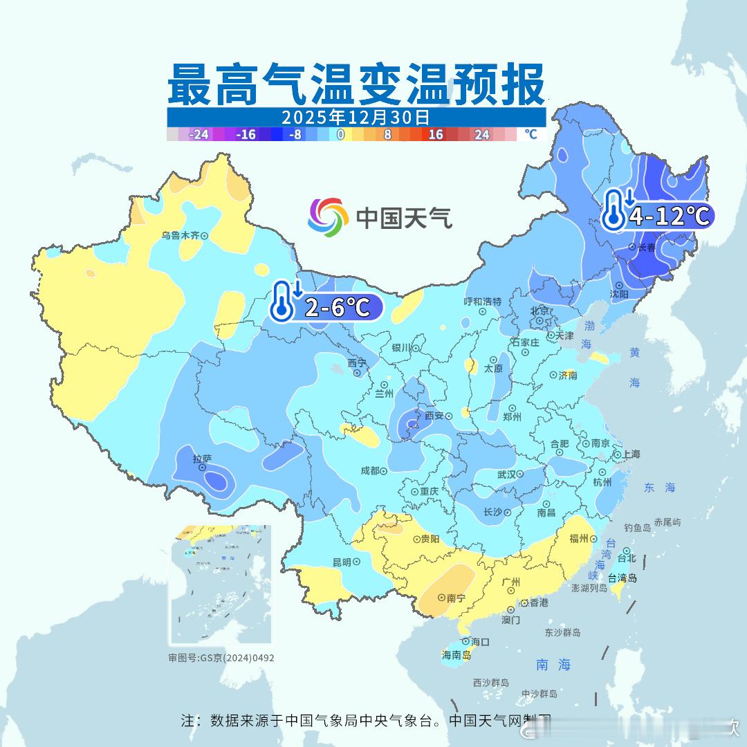 【气温转折】近期的升温即将结束,未来3天冷空气不断东移南下,从东北华北多地,气温将持续下滑。南方地区降温会晚一些,但长江中下游沿线从30日开始,江南地区从31日开始,气温也陆续下降。对比今天实况和未来3天预报,无论是-10℃、0℃、10℃线,都向南收缩。从图5形势预报看,绿色的冷高压不断增强并缓慢南下。东北地区还是未来气温波动最大的区域,哈尔滨今天最高零下1.4℃,31日最高可能降至零下19℃;长春今天最高0.3℃,31日最高零下15℃;沈阳今天最高3.7℃,1月1日最高零下11℃。也就是未来3-4天,东北三个省会,最高气温将下降15-18℃。长江流域未来降幅没有东北明显,但累计降温也有10℃左右,注意保暖。