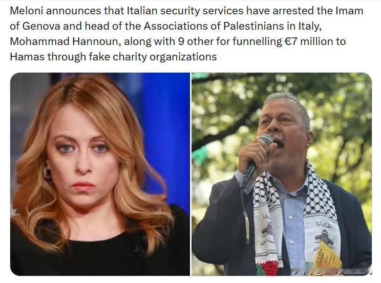 梅洛尼宣布,意大利安全部门逮捕了热那亚的伊玛目、意大利巴勒斯坦人协会负责人穆罕默德·哈努恩及其他9人,他们通过虚假慈善组织向哈马斯转移了700万欧元。