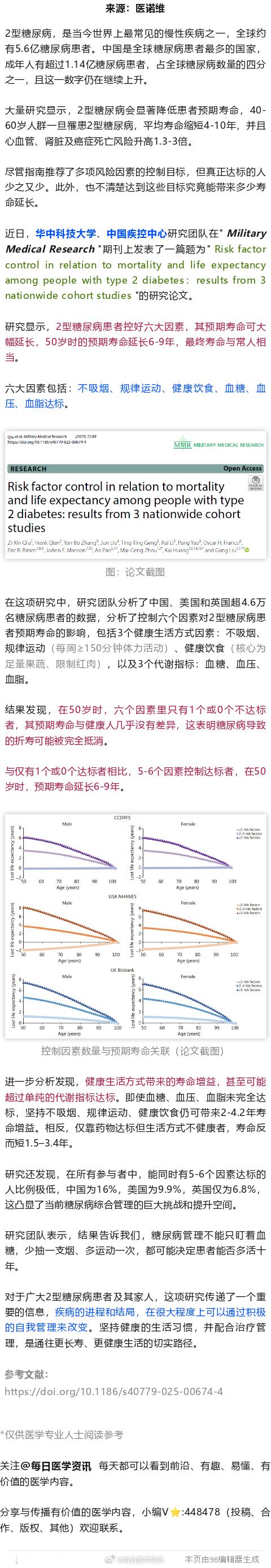 健闻登顶计划 华中大团队发现,糖友做好这几点,可延寿6-9年,寿命与常人相当近日,华中科技大学、中国疾控中心研究团队在" Military Medical Research "期刊上发表了一篇题为" Risk factor control in relation to mortality and life expectancy among people with type 2 diabetes:results from 3 nationwide cohort studies "的研究论文。研究显示,2型糖尿病患者控好六大因素,其预期寿命可大幅延长,50岁时的预期寿命延长6-9年,最终寿命与常人相当。六大因素包括:不吸烟、规律运动、健康饮食、血糖、血压、血脂达标。