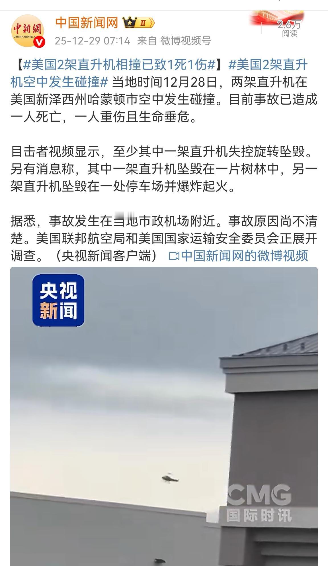 老美社会新闻越来越离奇了,两架直升机居然能在空中相撞,这是什么概率? 根据媒体报道12月28日老美哈蒙顿市,两架直升机在空中发生碰撞后,一架直接坠毁在停车场爆炸燃烧,另一架比较幸运坠毁在森林中。 有没有网友出来说一下,那么大的天空,两架直升机为什么还非要抱在一起?