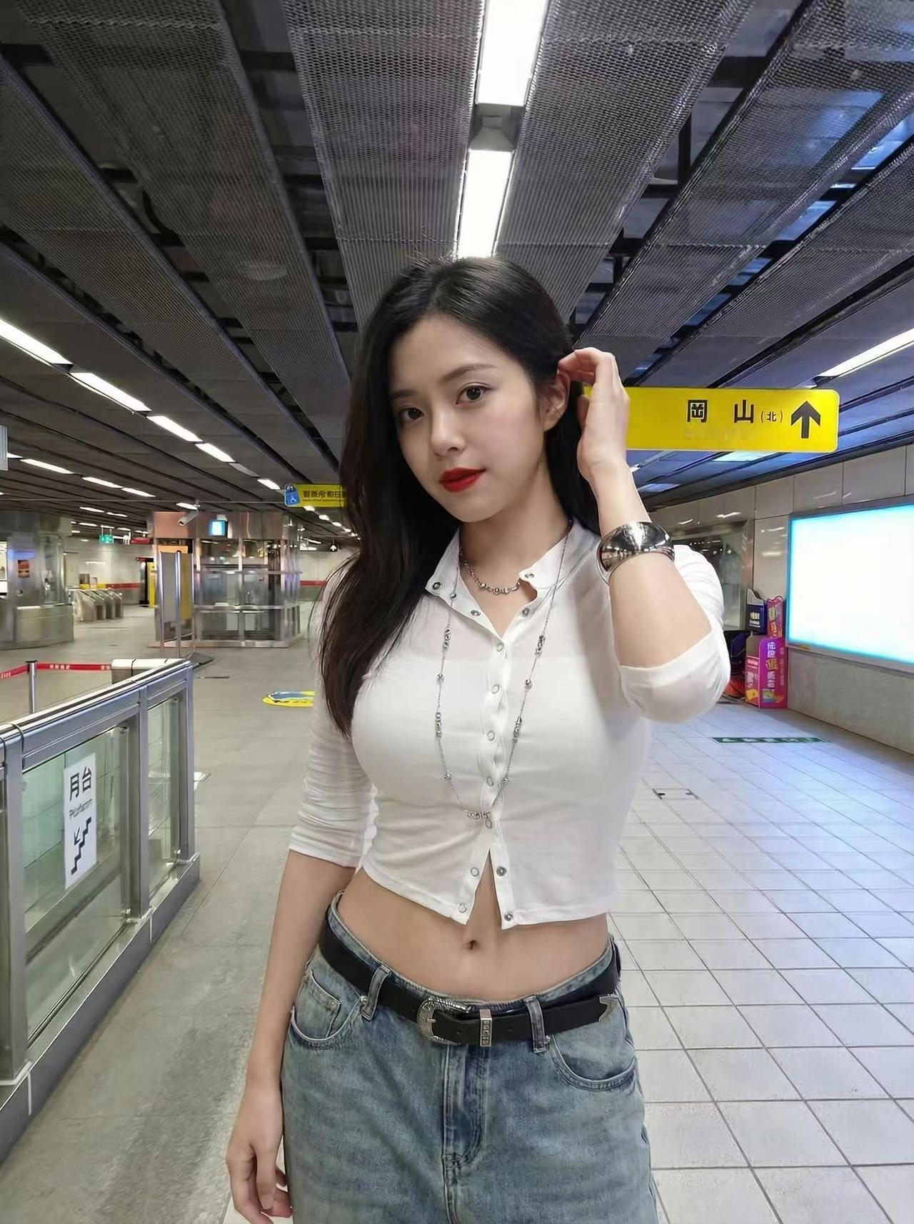 阳光下的甜美少女,白色蕾丝上衣搭配灰色短裙,清新自然,今日打卡拍照