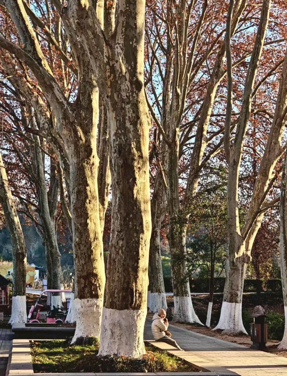 ✨老树枝桠筛着晴日的碎金,步道在树间铺向岁月深处,有人坐着的角落,正盛着整个秋天的静谧与暖。 🌿树干披着白霜似的光阴,秋叶在枝头蘸着阳光写诗,长椅上的身影,把季节的温柔都拢进了暮色前的时光里。