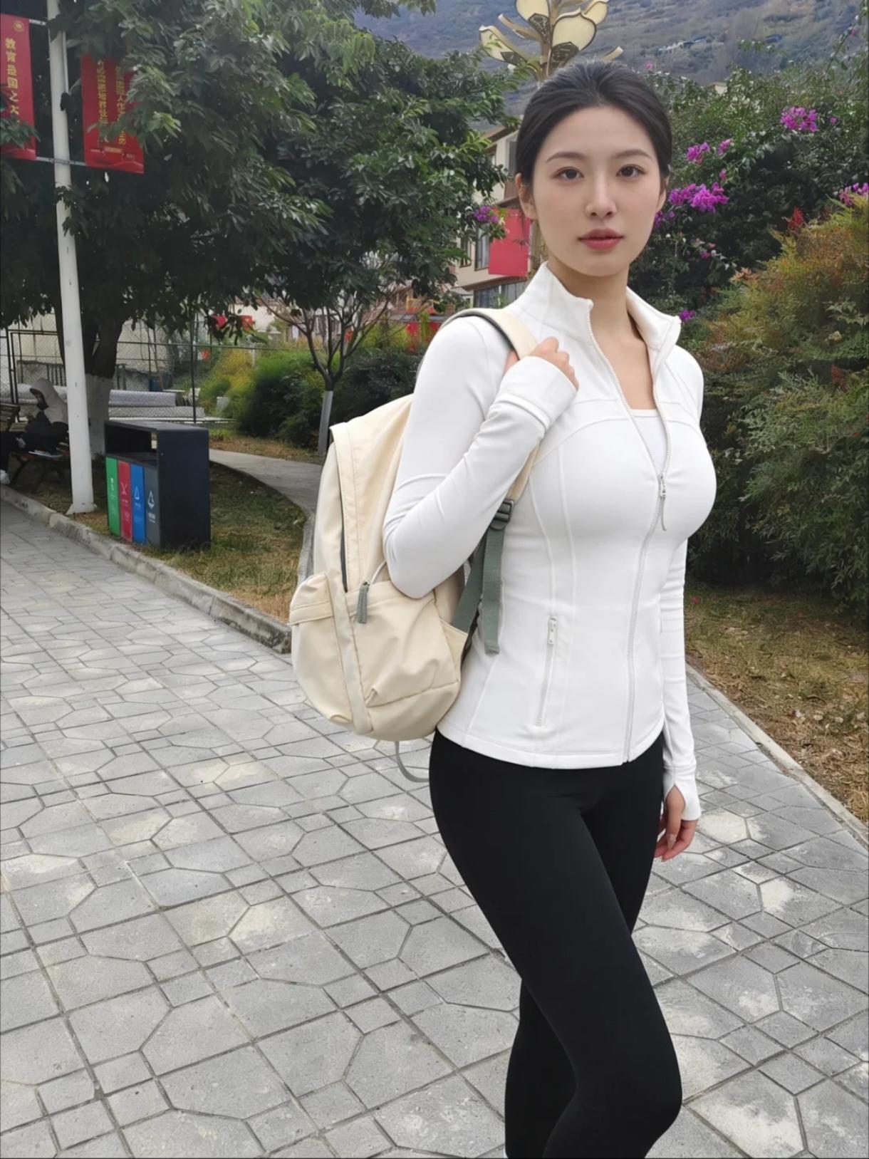 白衫裁瘦影,黑裤裹纤腰。布包斜挎步轻摇,径畔风撩鬓发,过林梢。 山色凝眉际,花香绕衣角。闲来郊野走一遭,不把尘愁细想,任逍遥。 郊外的石板路铺得平平展展,踩上去磕着鞋底轻响,白运动衫的拉链拉到胸口,风从领口钻进来,凉丝丝的却不觉得冷。黑色的紧身裤裹着腿,步子迈得轻快,米色的布背包晃在肩头,带子滑到胳膊肘也懒得去扯,就由着它晃悠。 路边的树影浓绿,枝桠上挂着零星的紫花,风一吹就飘来淡淡的香。远处的山影朦朦胧胧的,像晕开的水墨画,抬眼望过去,心里的那些琐碎事都跟着散了。就这么沿着步道慢慢走,不用赶时间,不用想工作,只听着风穿过树叶的声响,闻着草木的清味,连呼吸都觉得畅快,这郊野的闲散时光,可比待在屋里舒服多了。