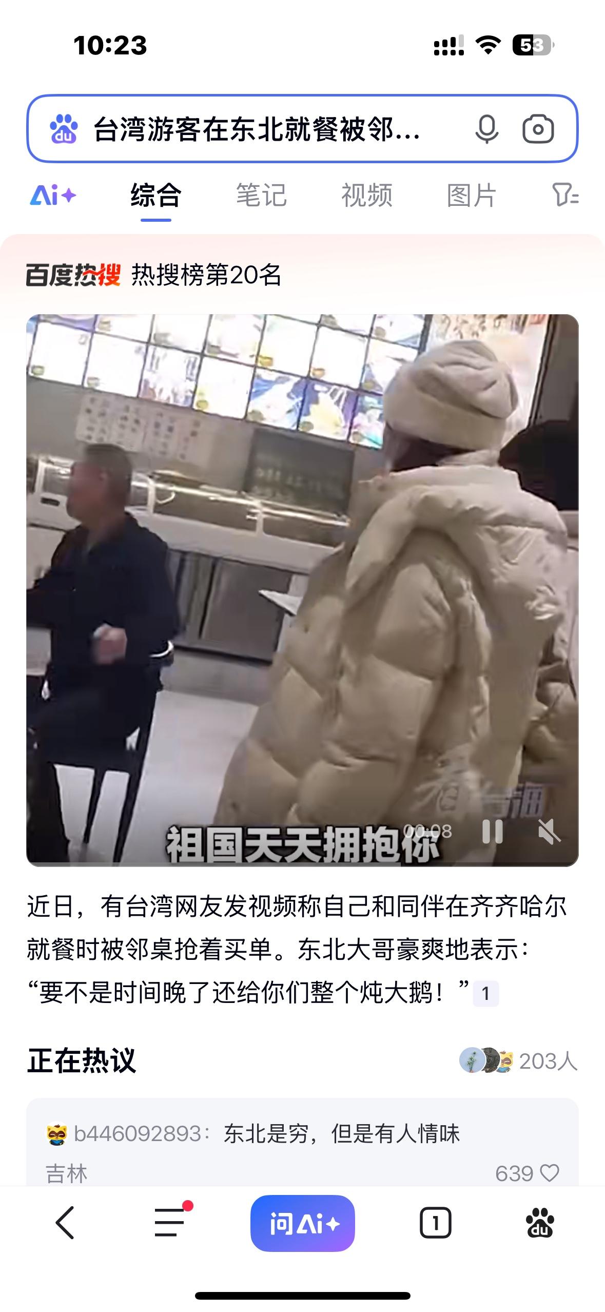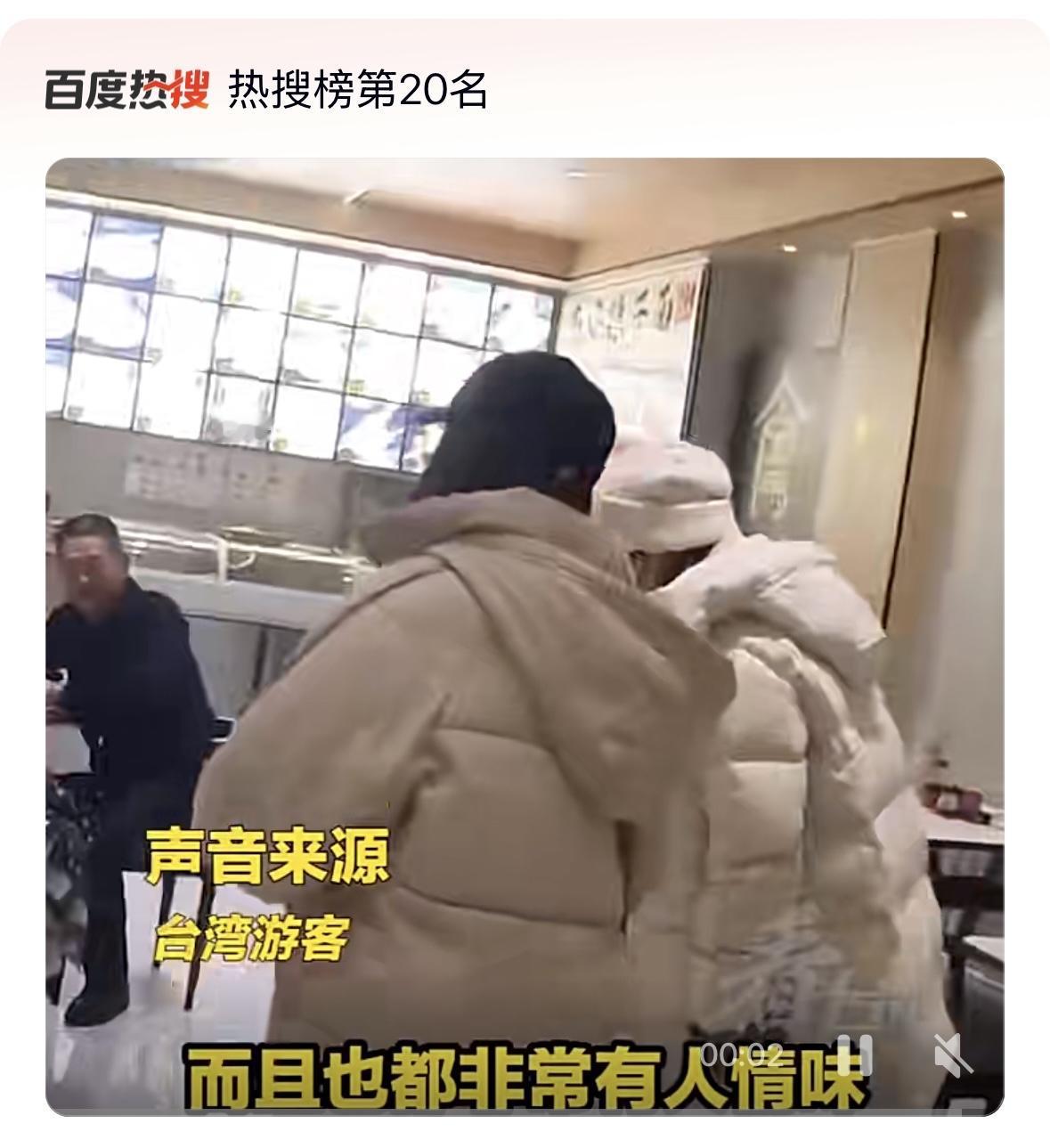 东北大哥给台湾妹子买单 近日,台湾网友晒视频爆料,其与同伴在齐齐哈尔吃饭时,遇邻桌东北大哥暖心抢着买单,大哥还大方说道,要是时间不算晚,还会为他们再添一道炖大鹅。