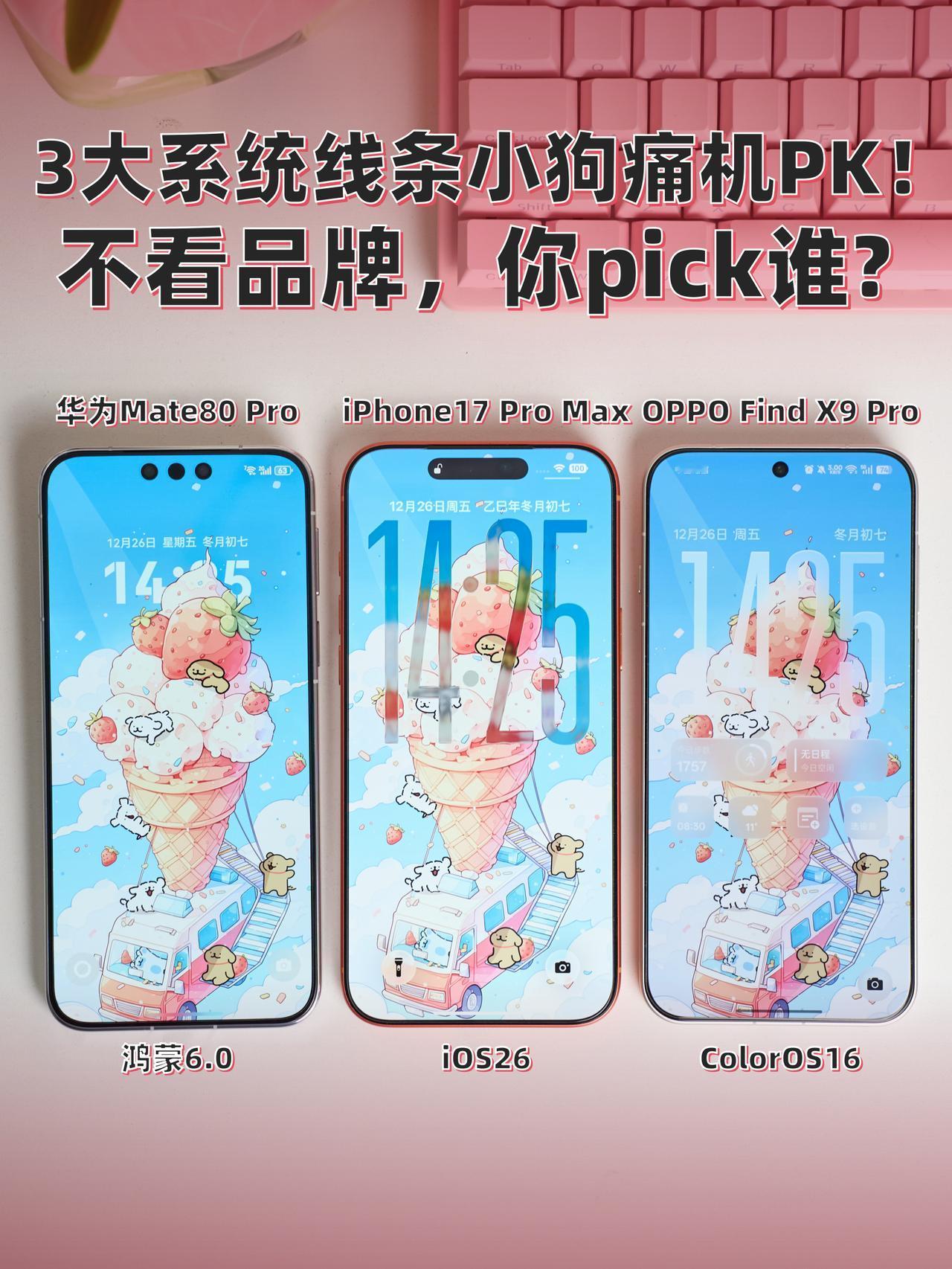 小白粉狂喜~3大系统线条小狗痛机PK! 把手机全都搞成了「小狗痛机」! iOS 26、鸿蒙6.0、ColorOS 16三大系统差别居然这么大! 🍎 iPhone 17 Pro Max (iOS 26) 苹果党表示有点卑微……目前主要是换换壁纸和锁屏。虽然可以用快捷指令手动改图标,但那个工程量真的会谢,而且没有全局主题,进到设置或对话界面就“一秒出戏”了。 🏵️ 华为 Mate 80 Pro (鸿蒙 6.0) 一键就能换上整套主题,同款壁纸 + 小狗图标 + 动态锁屏全配齐,天气插件还能显示小狗爪印,统一性拉满~ 但缺点也明显:没有 “小狗大军” 玩法(不能切视角放大看 APP 里的小狗细节),工具栏适配一般,互动感少了点,只能看不能 “玩”。 ⭕ OPPO Find X9 Pro(ColorOS16): 除了全套主题 UI,它连对话气泡、小组件、系统细节都能一起换; 👉 锁屏还能直接玩线条小狗小游戏,像寿司店、鸡排主理人、煎饼果子这种,等电梯、排队的时候点两下,真的很上头。 还有一个细节我特别喜欢: OPPO主题里有那种“小狗大军”的设计, 桌面APP全是线条小狗元素,点进去还能切视角、放大看,连系统工具栏的小组件都完全适配,沉浸感直接拉满。 最近ColorOS 16更新系统后,还新增AI写作功能,写文案、总结一键搞定,还能选风格;AI妙听功能可以把公文章转成音频,通勤时听文章很舒服~听说元旦OPPO Find X9系列还有3重礼活动,全系国补至多减500+24期+299的礼盒,近期计划换机的伙伴爽了😏 线条小狗 出圈吧2026 手机主题 OPPOFindX9Pro 华为Mate80Pro iPhone17ProMax ColorOS16