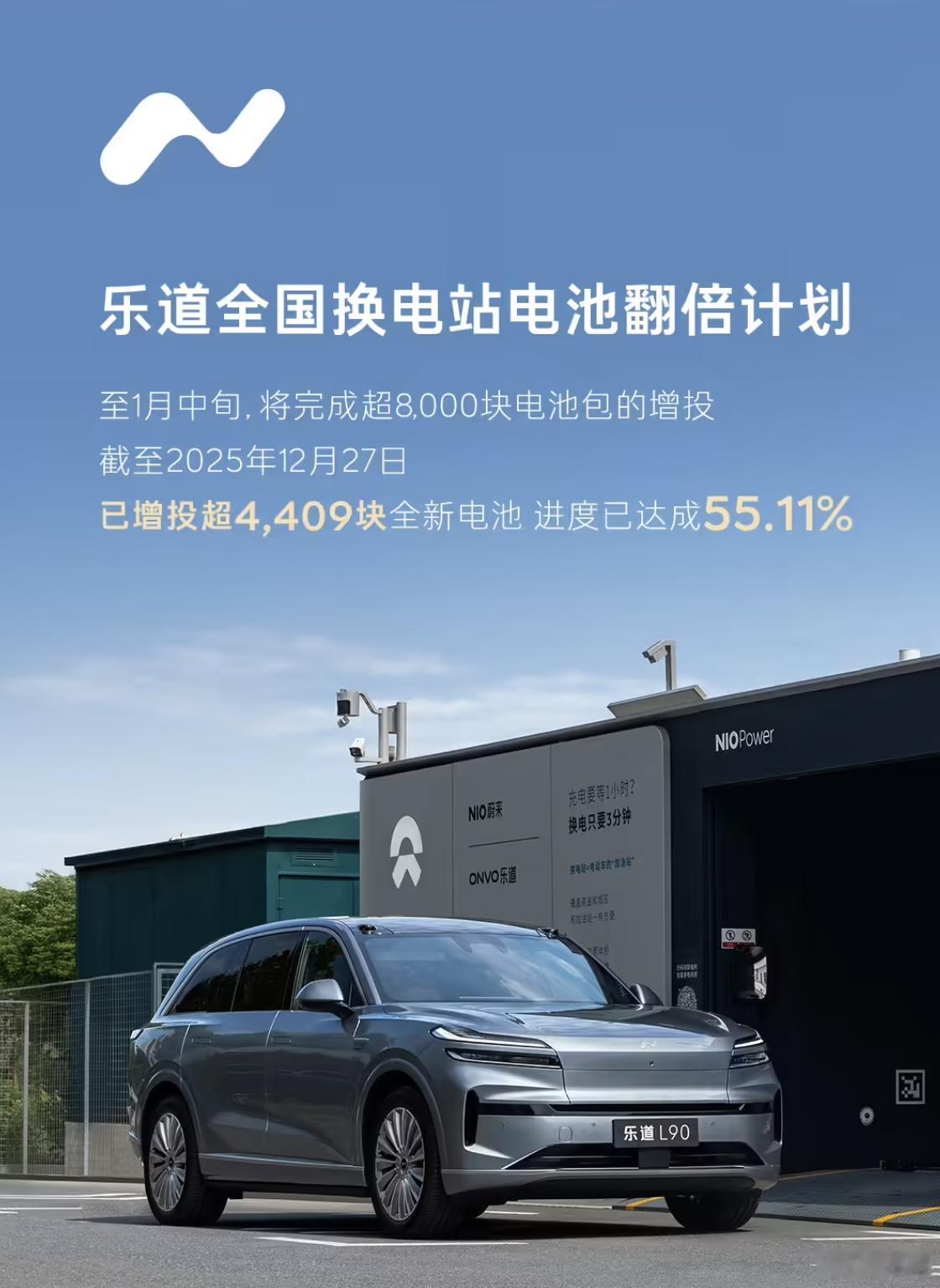 12 月 29 日消息,蔚来乐道汽车于日前披露旗下电池翻倍计划的最新进展。数据显示,截至 12 月 27 日,乐道已累计增投全新电池超 4409 块,该计划整体完成度达 55.11%,进度过半。按照规划,到明年 1 月中旬,乐道将完成超 8000 块全新电池包的增投任务,正式达成电池翻倍的既定目标。蔚来汽车蔚来乐道