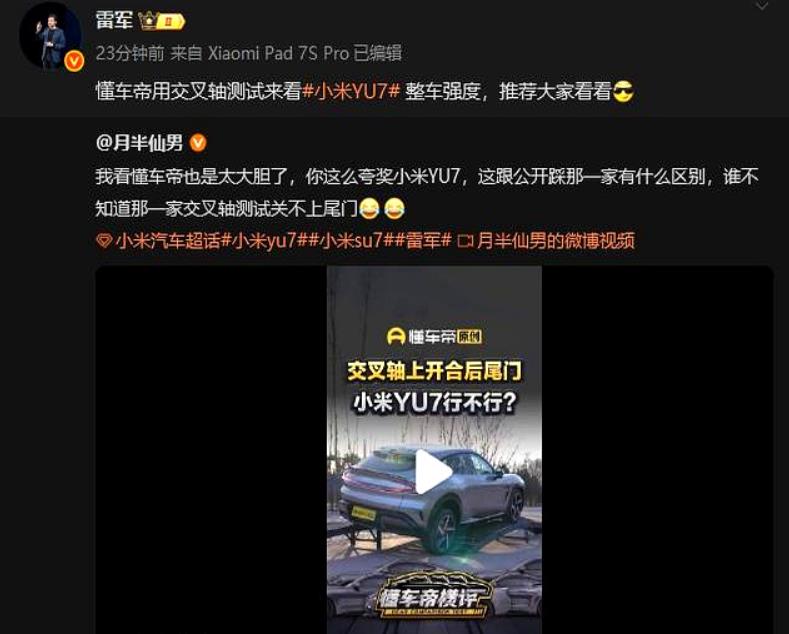 雷军确实善于营销。有媒体测试问界M7交叉轴关不上尾门,懂车帝立马来了个小米YU7交叉轴上关合尾门的测试,并迎来了雷军的转发。营销大师不愧是营销大师,这波营销操作如同行云流水,堪称顶级水平。懂车帝又立下了汗马功劳。
