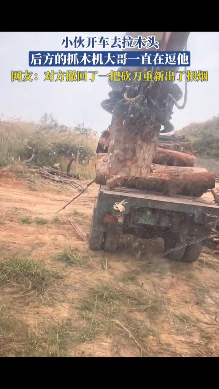 小伙开车去拉木头,后方的抓木机大哥一直在逗他。 网友:对方撤回了一把砍刀重新出了