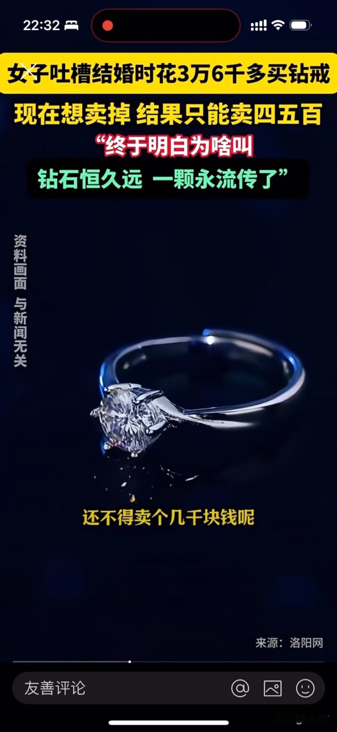 “真是亏大了”!女子吐槽说,2019年结婚时花了3.6万元买了一颗钻戒,现在要用钱,打算把钻戒卖了。店家:只值四五百。 女子说:终于明白了那句话的含义:钻石恒久远,一颗永流传,原来是因为卖不出去啊! 以前父辈们结婚时,除了结婚仪式、彩礼,还会给老婆买黄金。但随着时代的变迁,年轻人越来越多地选择钻戒来表达爱意。 河南的李女士在2019年结婚时,想买一颗钻戒。因为广告语说的好,钻石代表着坚贞的爱情。“钻石恒久远,一颗永流传。”更是当时无人不晓的广告语。 她的男朋友也想给她一个永久的承诺,在结婚前夕专门去香港给她定制了这一颗专属于她的石头。戴上这枚爱意满满的钻戒,李女士心里头被爱意地暖暖的。 最近一段时间,听说现在钻戒的价格越来越低,李女士刚好也不想戴了。放在家里还不如卖掉。于是今年打算把就想把这枚钻戒卖掉。 万万没想到的是,店家只给出了四五百的价格,这个价格还是因为钻戒的底座是铂金的,才值这个钱。 李女士哭笑不得,钻石掉价也太厉害了吧,等于白卖了。李女士说,当初要是听妈妈的话,把这些钱拿来买了黄金,现在值个十来万吧! 网友说,别卖了,就留着吧,结婚戒指是有纪念意义的,别被价格左右了 大家当初结婚时都买钻戒了吗? 取材网络,侵删