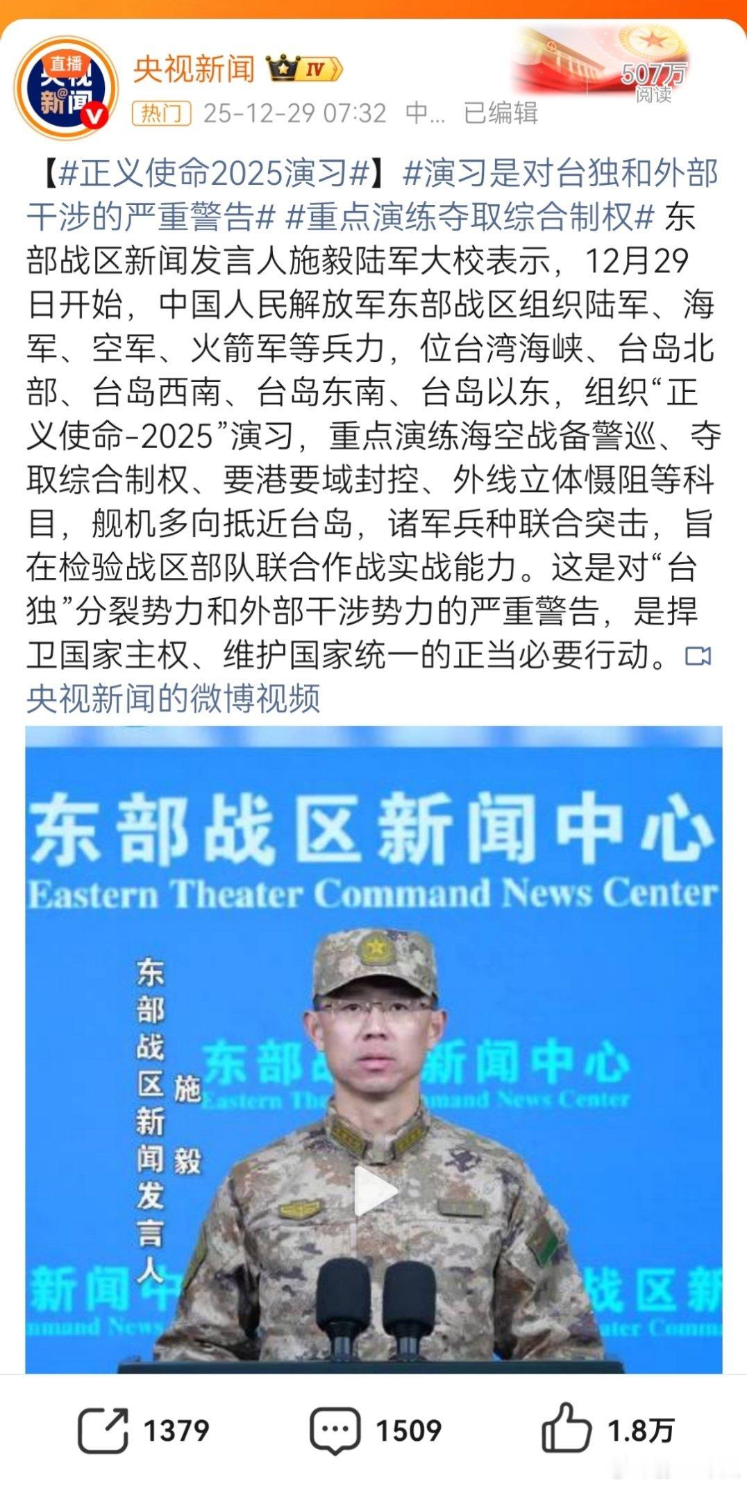 东部战区开展正义使命2025演习:演习是对台独和外部干涉的严重警告重点演练夺取综合制权 。展示力量,让外部势力了解中国不可战胜。这是对美国销售台湾武器110亿美元的破纪录和对高市早苗介入台海谬论的反击。12月29日起部战区组织陆军、海军、空军、火箭军等兵力,位台湾海峡、台岛北部、台岛西南、台岛东南、台岛以东,组织“正义使命-2025”演习,重点演练海空战备警巡、夺取综合制权、要港要域封控、外线立体慑阻等科目。当然,我觉得最好的办法还是宣布支持台独个人和单位要高额罚款,十年期以上台“国债”统一后不偿还最好,因为是支持台购买武器的恶债。