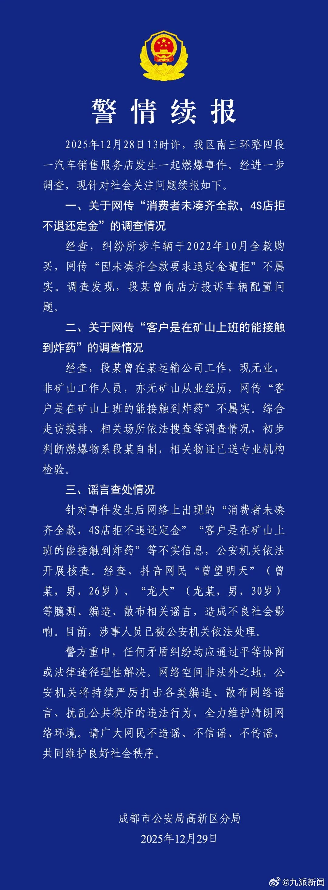 #燃爆事件4S店拒不退还定金不实#【#成都警方通报涉燃爆事件不实信息#】12月29日 成都市公安局高新区分局发布警情续报:“2025年12月28日13时许,我区南三环路四段一汽车销售服务店发生一起燃爆事件。经进一步调查,现针对社会关注问题续报如下”:#警方通报4S店燃爆事件详情#一、关于网传“消费者未凑齐全款,4S店拒不退还定金”的调查情况:经查,纠纷所涉车辆于2022年10月全款购买,网传“因未凑齐全款要求退定金遭拒”不属实。调查发现,段某曾向店方投诉车辆配置问题二、关于网传“客户是在矿山上班的能接触到炸药”的调查情况:经查,段某曾在某运输公司工作,现无业,非矿山工作人员,亦无矿山从业经历,网传“客户是在矿山上班的能接触到炸药”不属实。综合走访摸排、相关场所依法搜查等调查情况,初步判断燃爆物系段某自制,相关物证已送专业机构检验。三、谣言查处情况:针对事件发生后网络上出现的“消费者未凑齐全款,4S店拒不退还定金”“客户是在矿山上班的能接触到炸药”等不实信息,公安机关依法开展核查。经查,抖音网民“曾望明天”(曾某,男,26岁)、“龙大”(龙某,男,30岁)等臆测、编造、散布相关谣言,造成不良社会影响。目前,涉事人员已被公安机关依法处理。