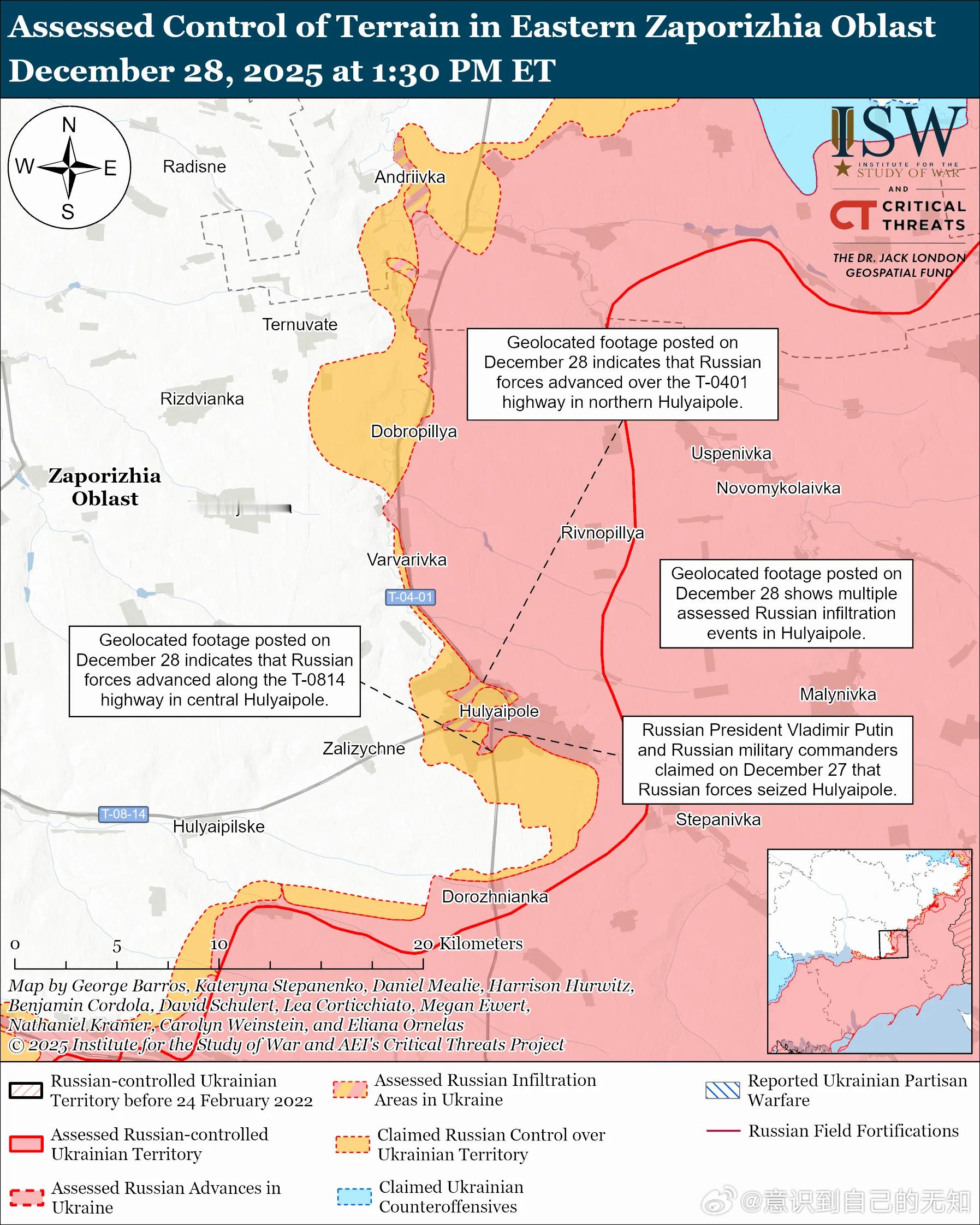 ISW仅根据公开来源的证据评估认为,俄军已在胡利亚伊波列约55%的区域开展行动。 12月27日发布的地理定位视频显示,俄军近期在胡利亚伊波列的北部、中部、南部和东南部推进。12月27日发布的其他地理定位视频显示,在ISW评估为俄军渗透行动期间,俄罗斯军人在胡利亚伊波列西部和西南部的多个地点升起了国旗。12月27日,乌克兰总参谋部和乌克兰南部国防军驳斥了俄罗斯关于占领胡利亚伊波列的说法,并表示乌克兰军队仍在城内进行防御作战,尽管局势“艰难”。南部国防军承认俄军控制了该镇的部分地区,但报告称乌克兰军队仍然控制着胡利亚伊波列的大部分地区。南方防卫军报告称,俄军在胡利亚波列拥有人员和装备方面的显著数量优势——这与ISW持续评估的结果一致,即俄军在将兵力集中于特定区域时能够取得进展,但往往是以牺牲其他地区为代价的。