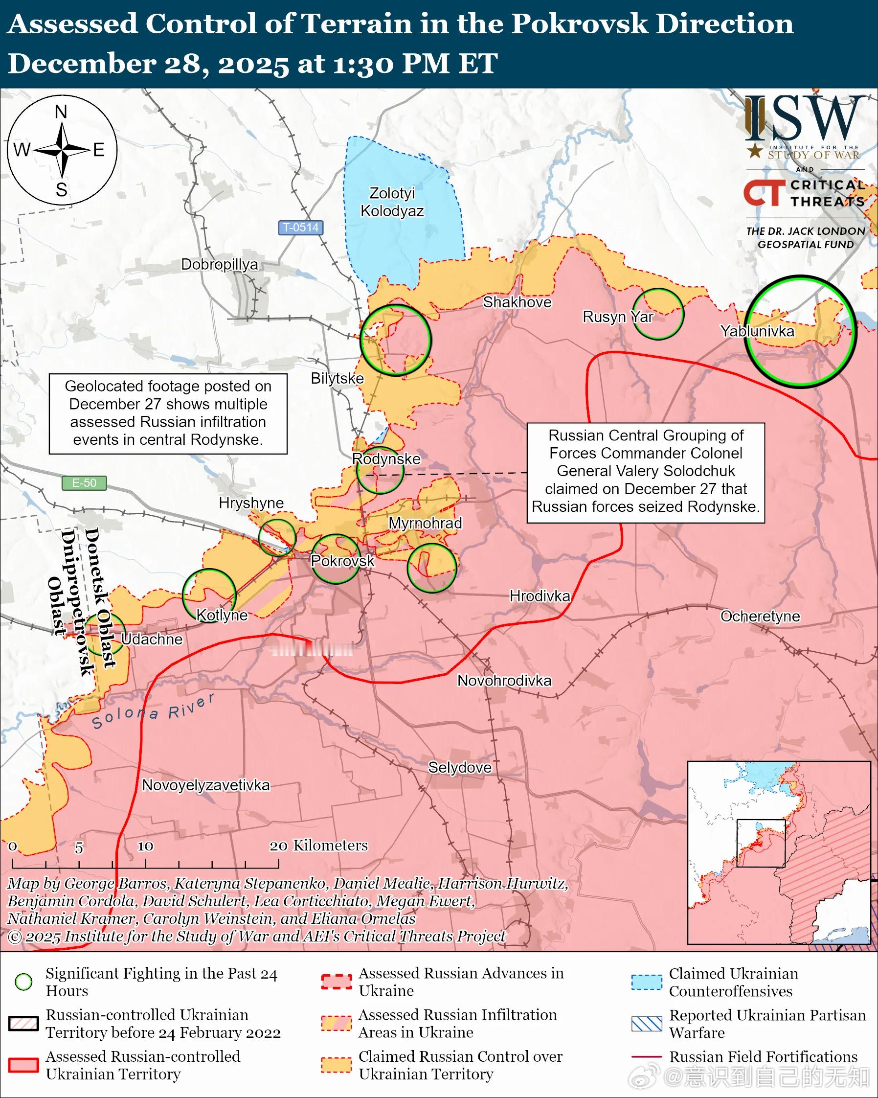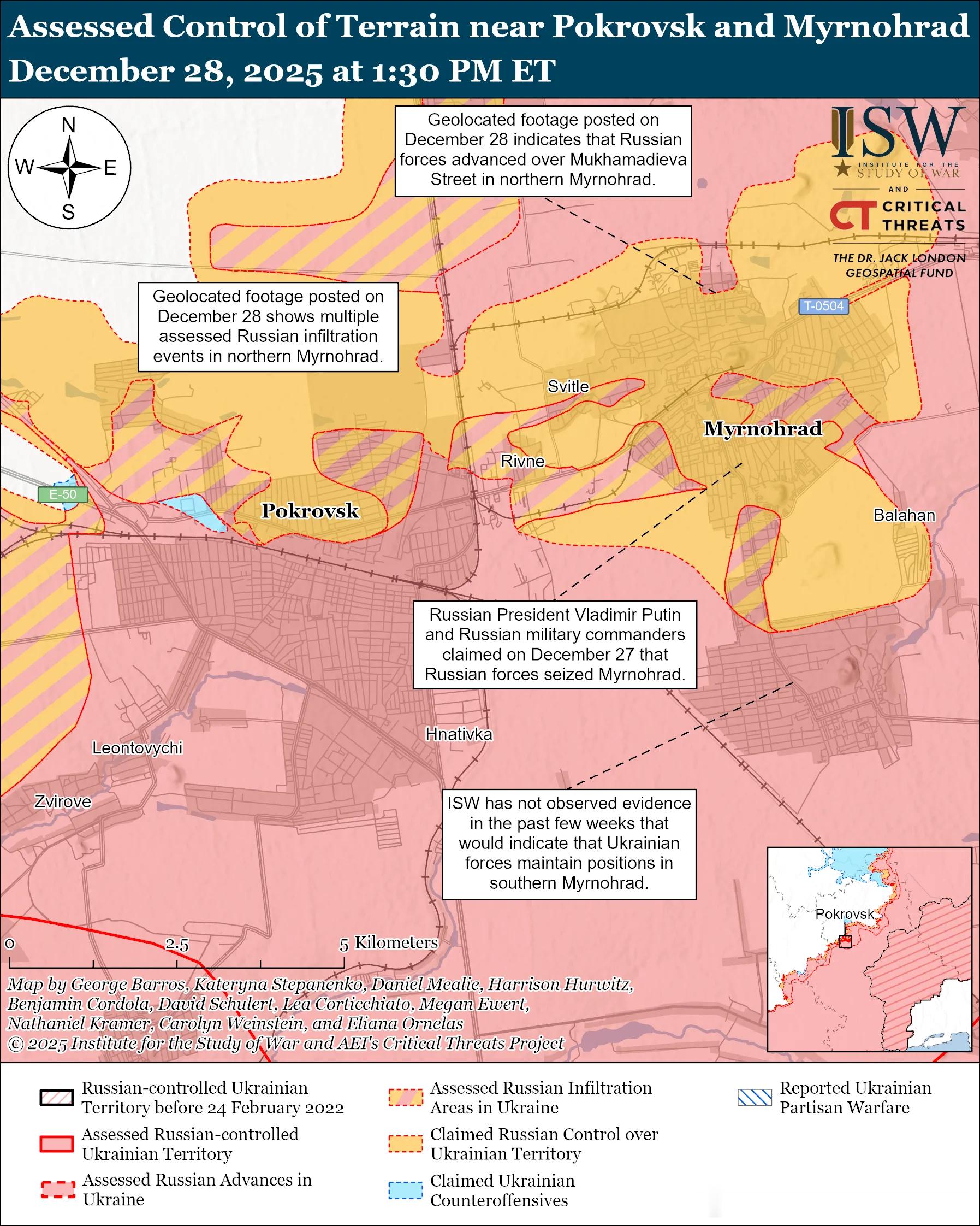 普京和指挥官们继续错误地将俄军未来夺取顿涅茨克州要塞带的行动描绘成一次快速而轻松的行动。要塞带由四个重兵把守的主要城镇组成——科斯蒂安蒂尼夫卡、德鲁日基夫卡、克拉马托尔斯克和斯拉维扬斯克——它们构成了乌克兰在顿涅茨克州防御的中坚力量。格拉西莫夫声称,俄军控制了科斯蒂安蒂尼夫卡一半以上的建筑物,并在最近占领锡韦尔斯克后“迅速”向斯拉维扬斯克推进。索洛丘克声称俄军占领了索菲伊夫卡,他称索菲伊夫卡是一个“重要的”定居点,也是俄军向北推进至要塞带城市发动进一步进攻的“关键”。但ISW仅在科斯蒂安蒂尼夫卡5%的区域观察到俄军存在的证据(无论是通过渗透行动还是进攻)。普京和指挥官们将俄军声称的战术层面的胜利,例如夺取索菲伊夫卡这样的小城镇,描绘成具有作战层面甚至战略层面的意义。乌克兰的“堡垒带”比俄军近年来占领的任何城镇或定居点都要大得多,而且自2022年以来,俄军并没有展现出迅速包围、渗透或以其他方式夺取如此规模城市的能力。ISW在2025年11月下旬评估认为,假设俄军届时能够保持目前的推进速度,他们也只能在2027年8月才能最终夺取顿涅茨克州的剩余部分。ISW观察了近期公开来源的证据,评估认为乌克兰军队在罗丁斯克保持着存在,而俄军在米尔诺赫拉德不到一半的区域内开展了行动。 12月28日发布的地理定位视频显示,乌克兰军队在罗丁斯克北部活动,表明乌克兰军队仍具备在该定居点开展行动的能力。12月27日发布的地理定位视频显示,俄军近期在米尔诺赫拉德北部推进。12月27日发布的另一段地理定位视频显示,俄军在米尔诺赫拉德北部和罗丁斯克中部多个地点升起了旗帜。ISW评估认为这些行动是俄军的渗透行动。ISW仅观察到证据表明,俄军(通过渗透行动或进攻)在米尔诺赫拉德49%的区域内存在。 12月27日,乌克兰总参谋部驳斥了俄方关于占领米尔诺赫拉德的说法,并指出俄军尚未占领波克罗夫斯克——尽管俄军已经在波克罗夫斯克城内战斗了近150天。12月28日,乌克兰空降突击部队第7快速反应军也报告称,乌克兰军队在波克罗夫斯克北部保持着阵地。
