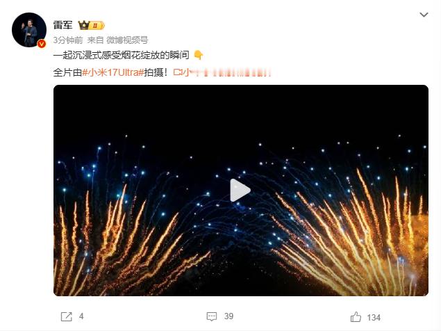 雷军带你看烟花12月29日,小米创始人雷军分享了一个由小米17Ultra拍摄的烟花绽放视频,并发文称:一起沉浸式感受烟花绽放的瞬间, 全片由小米17Ultra拍摄!雷军带你沉浸式感受烟花绽放瞬间