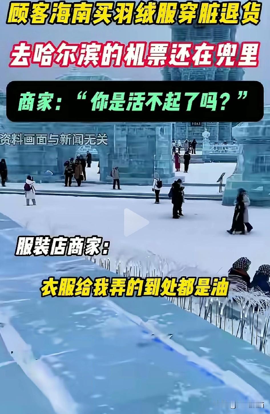 吃相确实难看, 羽绒服穿了半个月,又给商家退了回去, 一个网店老板发视频抱怨,一位海南的顾客去哈尔滨旅游,买了一件长款的羽绒服,可等她游玩回来以后,就立即把羽绒服进行无理由退货,机票还在衣服里边呢。 关键是穿了半个多月,油渍污渍一大片,让商家根本无法再进行二次销售。 有人说这都是无理由退货惹的祸,这种事件不止曝光一次两次了,但也有人认为消费者的权益必须保护,之所以这样只是个别人的素质问题,但是就对这种人没有任何办法,商家只能自认倒霉了。