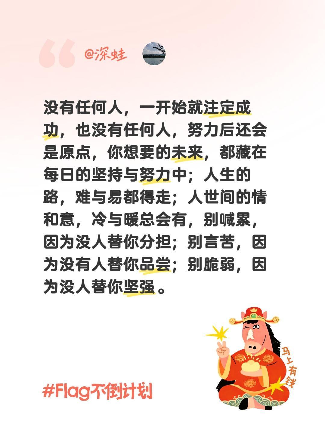 没有任何人,一开始就注定成功,也没有任何人,努力后还会是原点,你想要的未来,都藏在每日的坚持与努力中;人生的路,难与易都得走;人世间的情和意,冷与暖总会有,别喊累,因为没人替你分担;别言苦,因为没有人替你品尝;别脆弱,因为没人替你坚强。