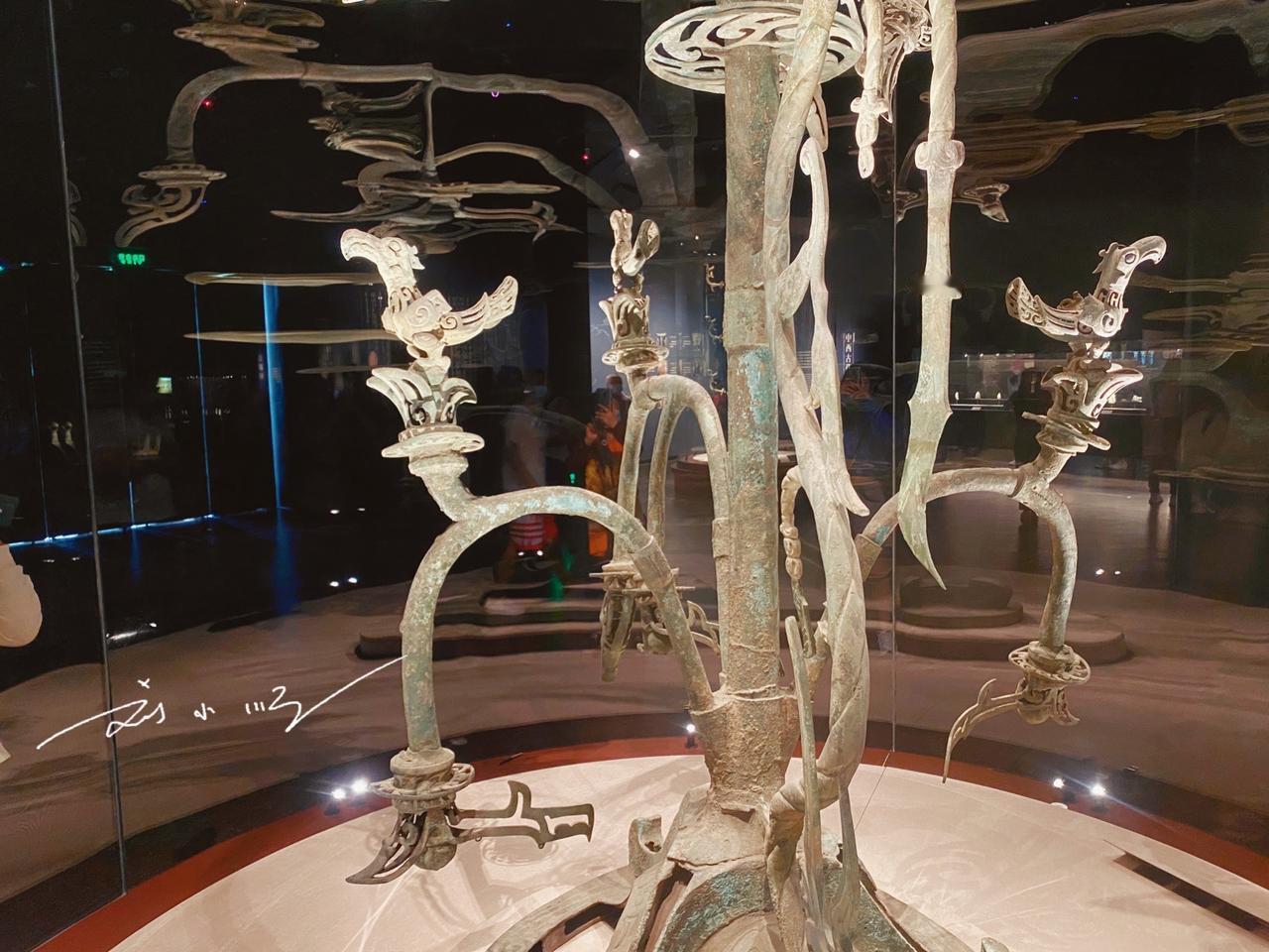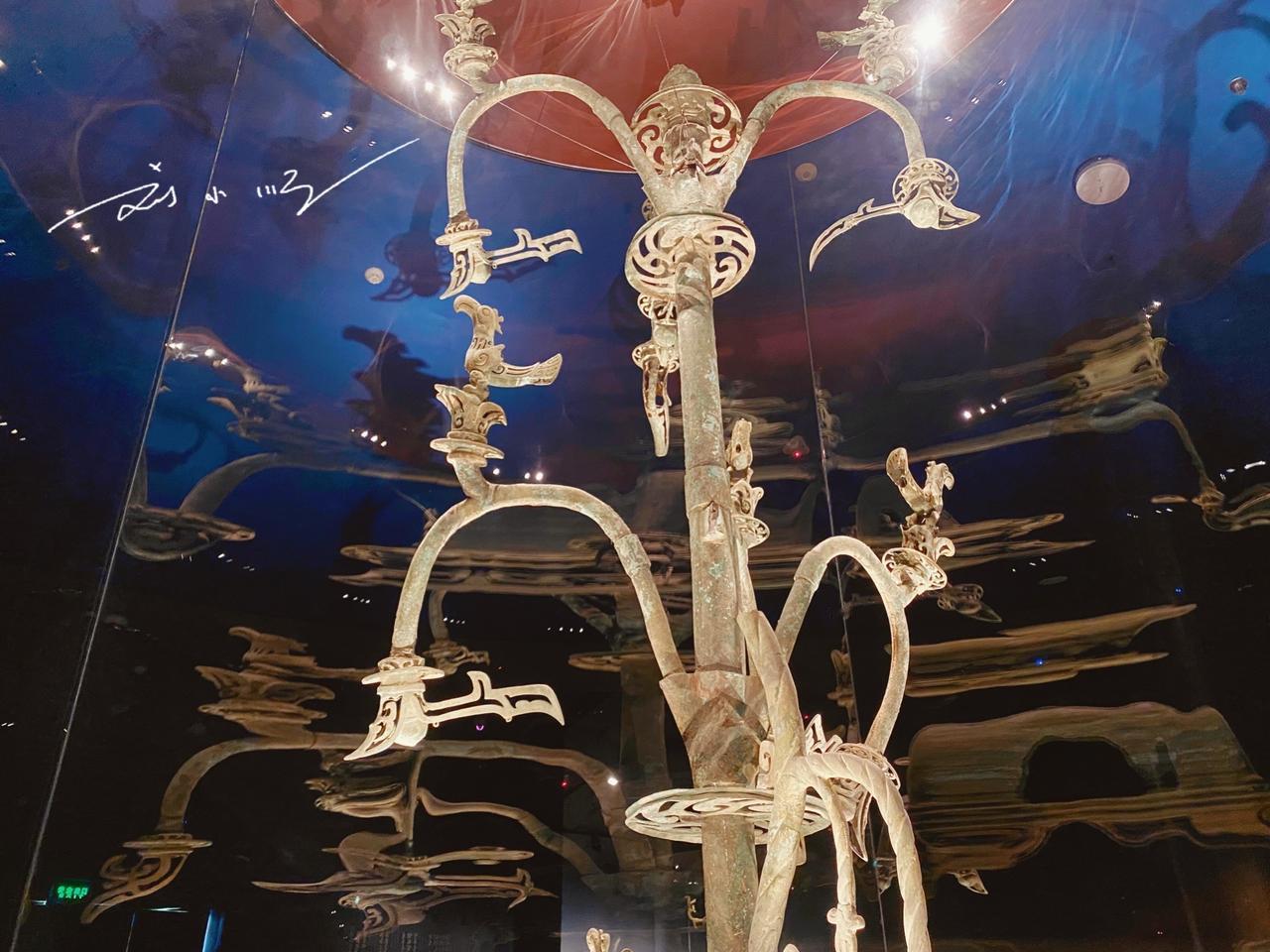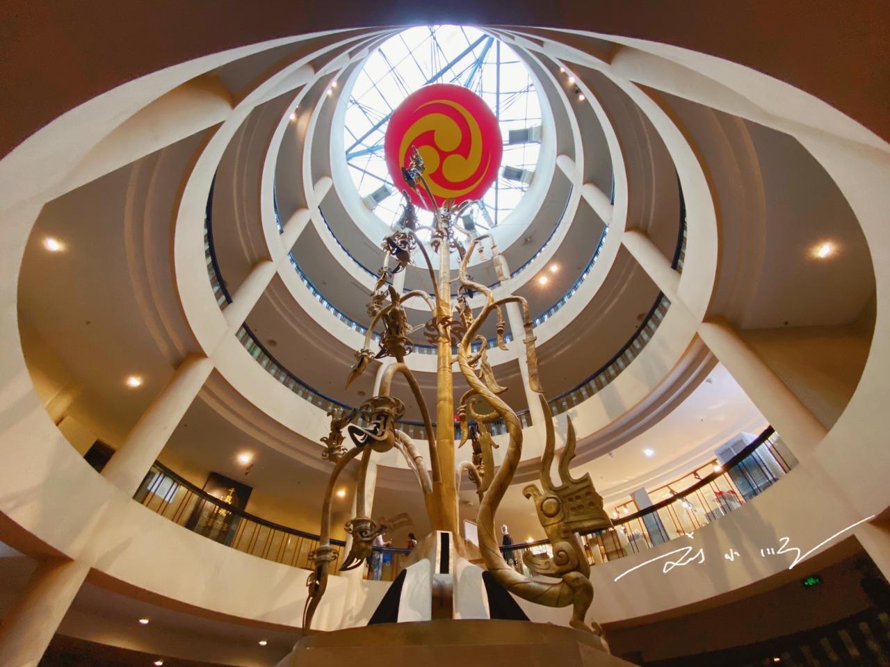 三星堆博物馆的“青铜神树”,是当之无愧的镇馆之宝,也是我国现存形体最大的青铜文物,更是游客到访必打卡的核心展品。 这尊神树出土于四川广汉三星堆遗址,遗址距今3000~5000年,是西南地区范围最大、内涵最丰富的古蜀文化遗址。因遗址暂未对游客开放,三星堆博物馆便成了了解古蜀文明的最佳窗口,这座国家一级博物馆设两个展馆,展陈面积近12000平方米。 青铜神树陈列于博物馆综合馆,通高3.96米,推测完整高度超5米,由底座、树身、龙三部分组成,采用套铸、铆铸等多种工艺分段铸造。神树分三层,每层三枝共九枝,枝头挂果,栖息着九只金乌神鸟,距今至少3000年。它被认为与古蜀“十日神话”相关,和传说中的扶桑、建木等神树渊源深厚,其复杂造型与精湛工艺举世无双,背后的文化寓意至今仍是未解之谜。 青铜神树的重要地位随处可见:青铜馆天井立有它的建筑装饰,文创商店里更是遍布以它为原型的纪念品,早已成为三星堆文化的标志性符号。你有没有来看过呢?