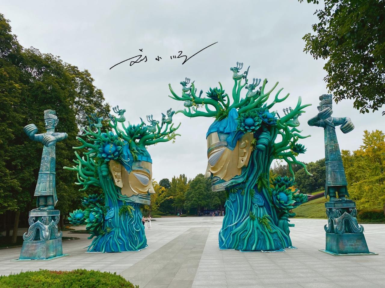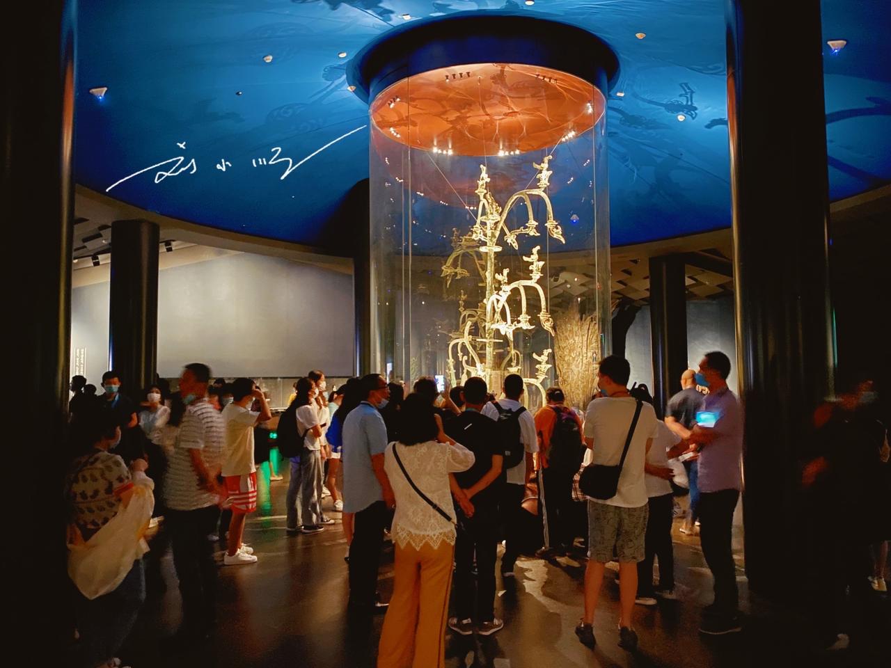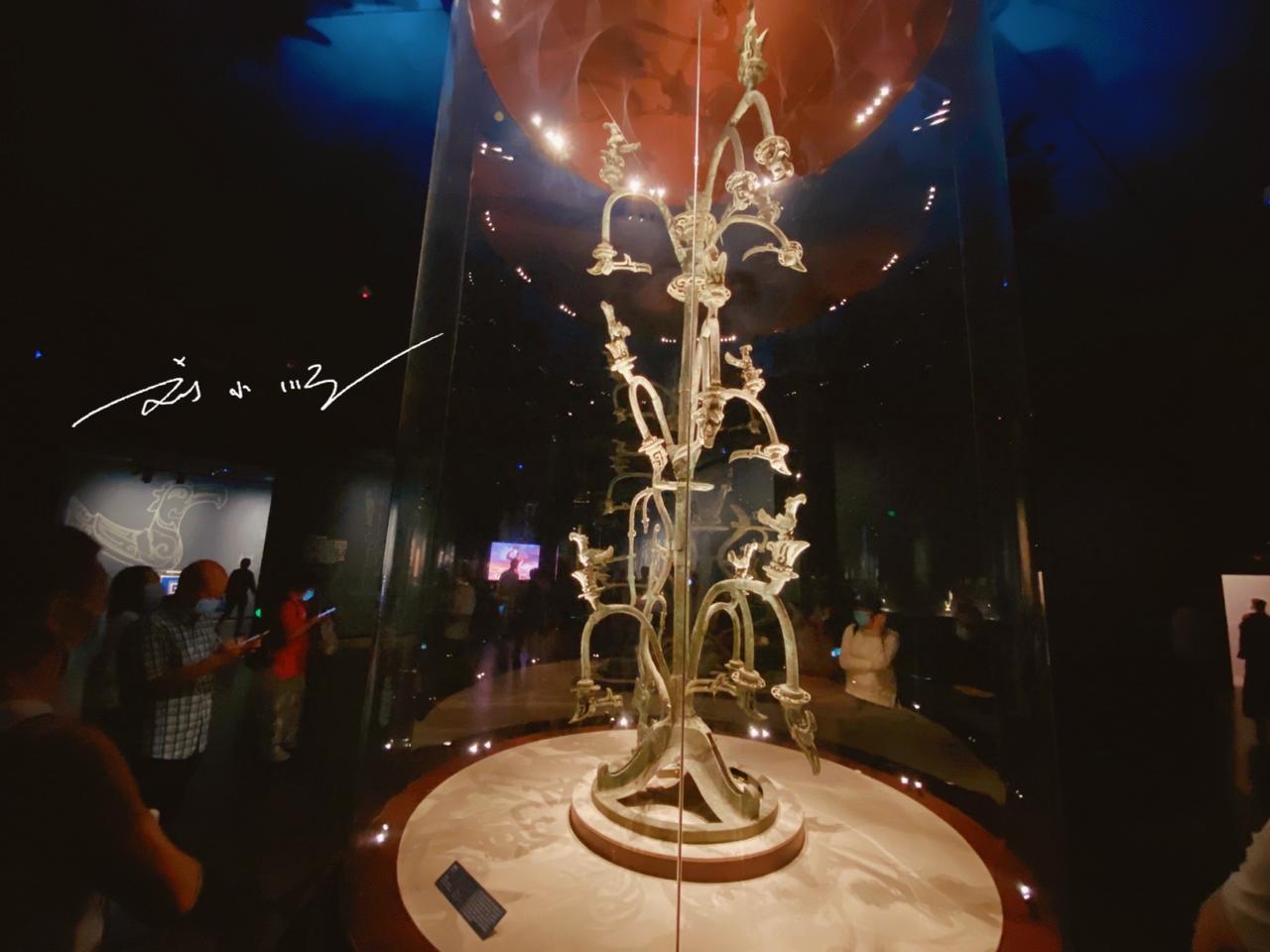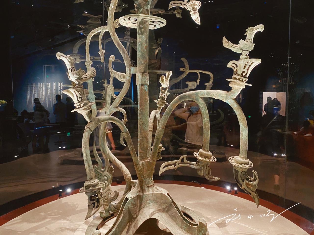 三星堆博物馆的“青铜神树”,是当之无愧的镇馆之宝,也是我国现存形体最大的青铜文物,更是游客到访必打卡的核心展品。 这尊神树出土于四川广汉三星堆遗址,遗址距今3000~5000年,是西南地区范围最大、内涵最丰富的古蜀文化遗址。因遗址暂未对游客开放,三星堆博物馆便成了了解古蜀文明的最佳窗口,这座国家一级博物馆设两个展馆,展陈面积近12000平方米。 青铜神树陈列于博物馆综合馆,通高3.96米,推测完整高度超5米,由底座、树身、龙三部分组成,采用套铸、铆铸等多种工艺分段铸造。神树分三层,每层三枝共九枝,枝头挂果,栖息着九只金乌神鸟,距今至少3000年。它被认为与古蜀“十日神话”相关,和传说中的扶桑、建木等神树渊源深厚,其复杂造型与精湛工艺举世无双,背后的文化寓意至今仍是未解之谜。 青铜神树的重要地位随处可见:青铜馆天井立有它的建筑装饰,文创商店里更是遍布以它为原型的纪念品,早已成为三星堆文化的标志性符号。你有没有来看过呢?