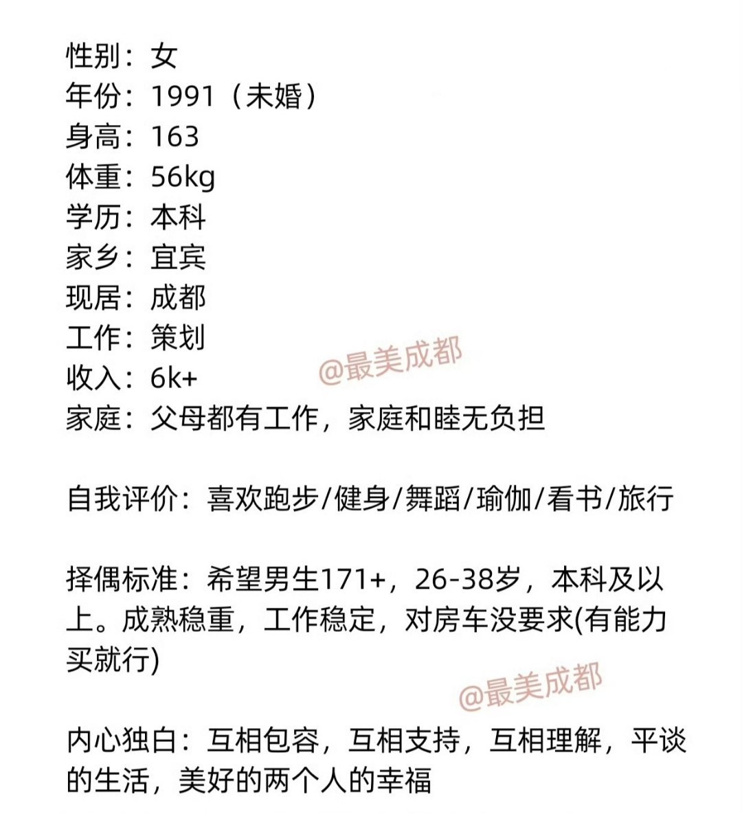 成都征婚【第7520号】91年宜宾女生,身高163,策划工作,月收入6K+,父母都有工作。希望男生171+,26-38岁,成熟稳重,工作稳定,最好有房或有购房能力… 详情戳图↓特约嘉宾——有意者请私信小美,投稿/加群/周末相亲会/小红娘1V1牵线 请私信! 成都征婚成都相亲