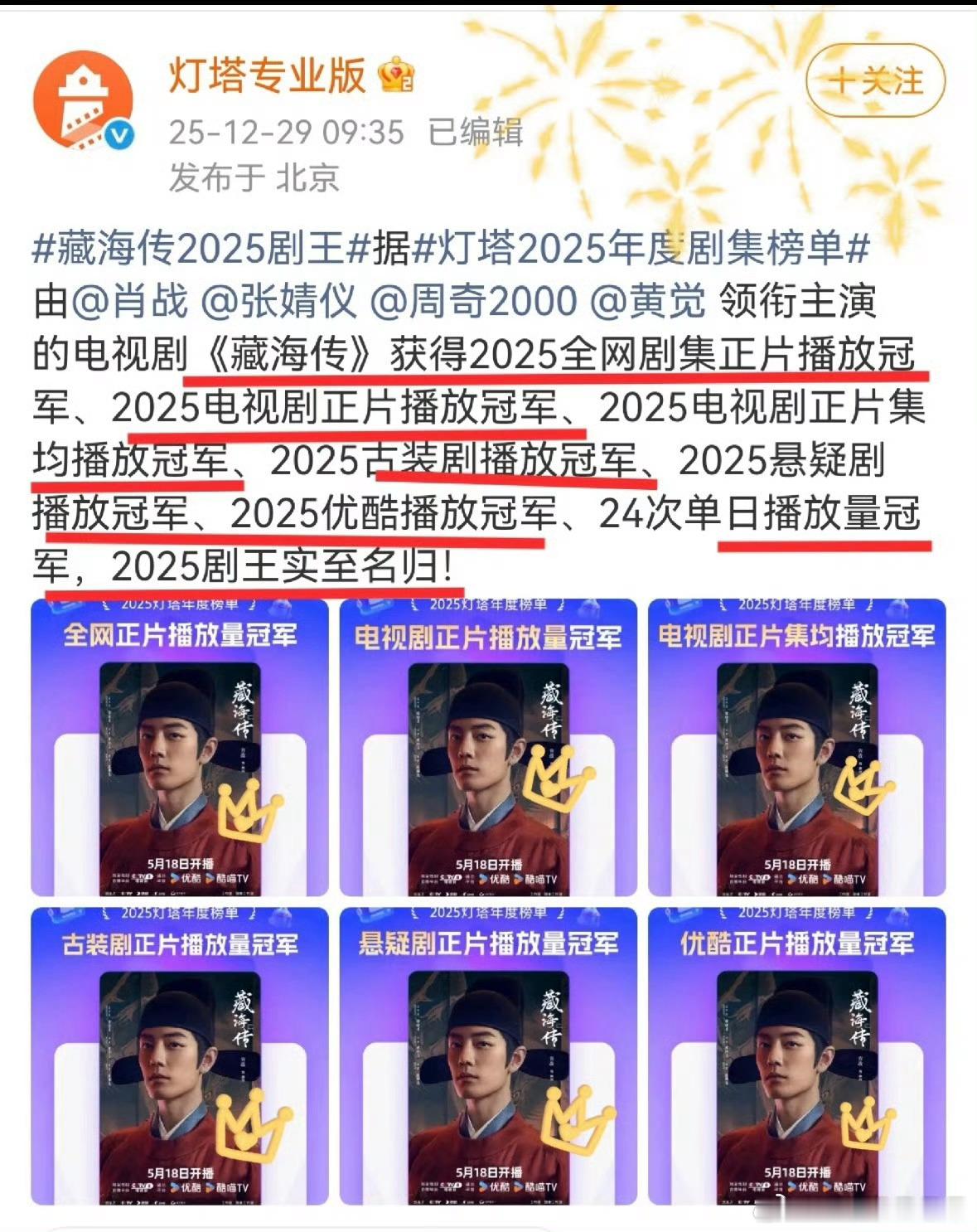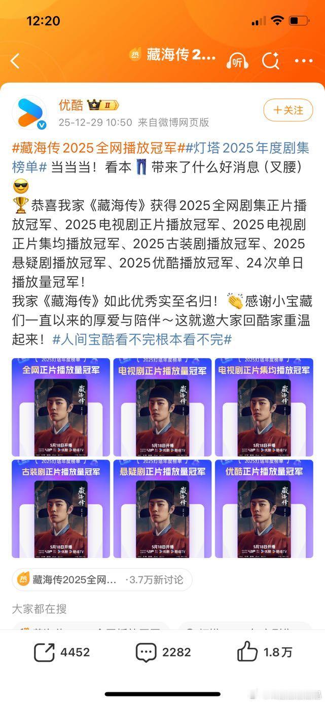 藏海传年度最热剧集藏海传不仅仅是今年的剧王,还拿了好多个细分市场的冠军!!! 裤子也一脸嘚瑟地出来秀了!非常骄傲的样子