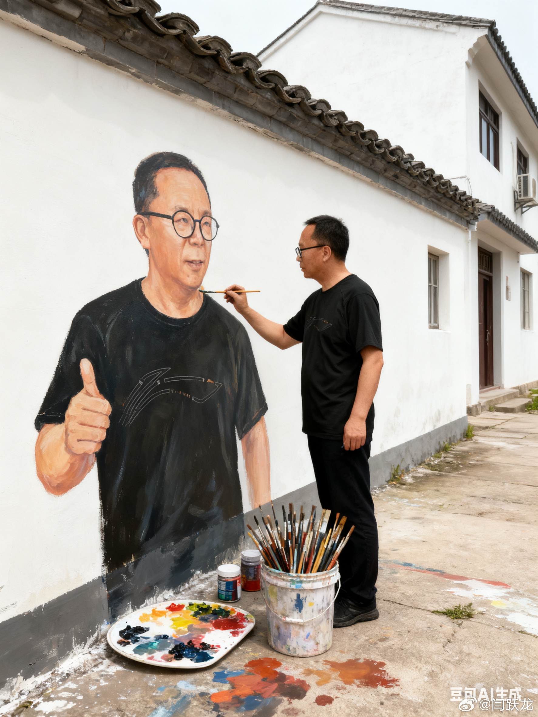 画个画,提示词:帮我生成图片:手持画笔,专注的为壁画中与自己着装一致的人物形象描绘细节,画面下方摆放着颜料盘颜料罐和装满画笔的桶,地面上含有颜料的痕迹,显示出创作的过程,背景是一栋白墙灰瓦。原比例。