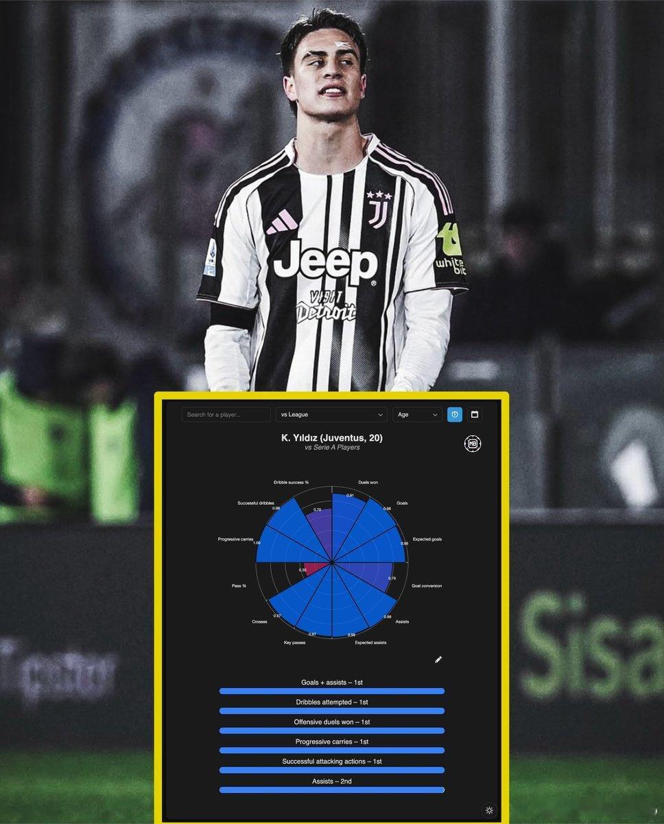 伊尔迪兹本赛季表现vs意甲其他球员:◉ 最多进球+助攻◉ 最多尝试盘带◉ 最多进攻对抗成功◉ 最多推进式带球◉ 最多成功的进攻动作土耳其超新星闪耀亚平宁!✨🇹🇷尤文图斯 意甲联赛 未来可期