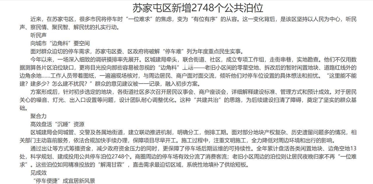 震耳欲聋的好消息,想听吗? 苏家屯区新增2748个公共泊位!太好了,苏家屯这回停车方便了,在辽阳灯塔的李先生说,之前去沈阳苏家屯停车费劲,现在增加了那么多停车位,周末逛街方便多了,尤其是沈阳周边的居民一般都会到苏家屯购物,或看病,区内的血栓医院非常出名,但是看病却无法停车,困扰沈阳都市圈的兄弟城市的市民到这里办事,这次直接整了2748个公共泊位,困扰苏家屯停车难的问题迎刃而解,这确实是好事情,是我们值得欢庆的事情,下一步希望大家规范停车,尽可能停车不要妨碍其他车辆通行,大屯子的交通进一步文明了起来,为沈阳建设东北亚国际化中心城市贡献微薄的力量!