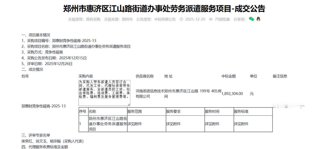 郑州市惠济区江山路街道办事处劳务派遣服务项目-成交公告,金额189.2万元