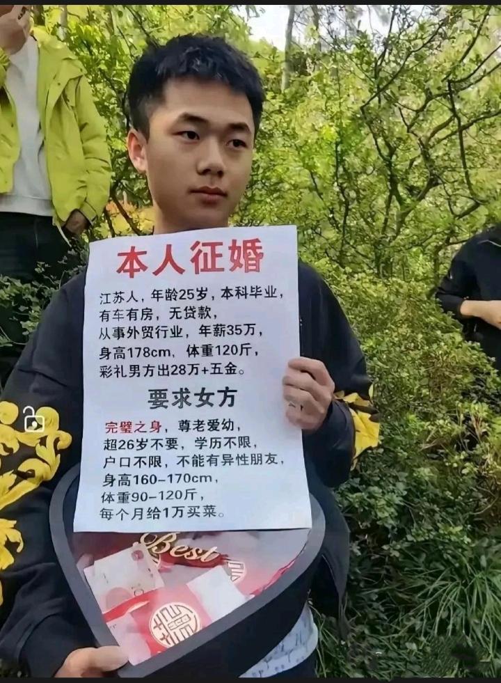 这个有点假! 一个年薪35万的帅气小伙子会找不到对象?还需要到公众场合举着牌子征婚? 是他的征婚条件太苛求了吗? 有人说对女方“完璧之身”的要求,就将90%的未婚女性打入了另册。若真是这样的话,那小伙子就只能举牌子了!