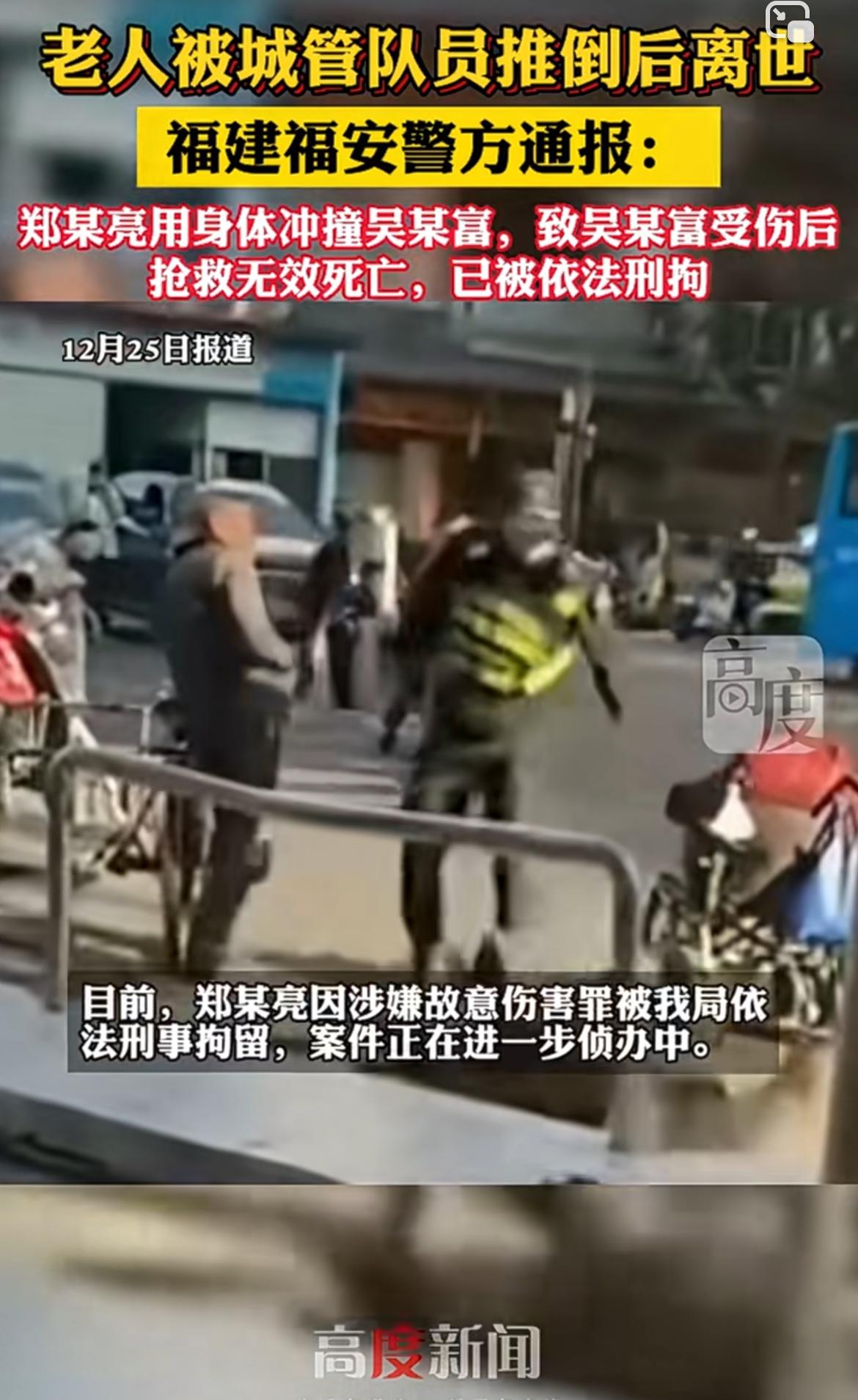 福建福安市这起老人被城管推倒后离世的事件闹得沸沸扬扬。12月20日,郑某亮与老人吴某富发生口角,用身体冲撞致其受伤,老人23日抢救无效死亡。目前郑某亮因涉嫌故意伤害罪被刑拘。 从网传视频看,穿城管制服的工作人员迎面跑来推倒老人。有网友称老人和城管口角争执后被推。可警方通报没提撞人者身份,引发质疑,有人吐槽“性别没了、职务没了”,还有人指出临时工也是代表城管执法。当地警方刑拘嫌疑人是对生命权的尊重,但通报还是得更坦诚透明,直面公众关切才行。
