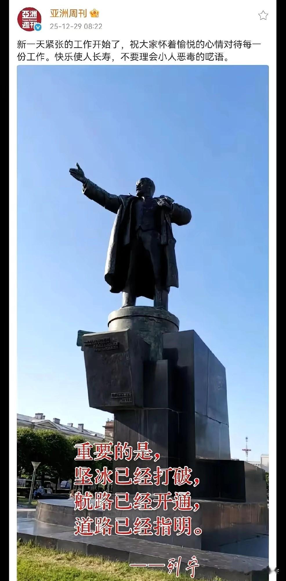 12月29日,亚洲周刊发布了一张列宁的雕像,并附上了列宁讲过的几句话:重要的是,