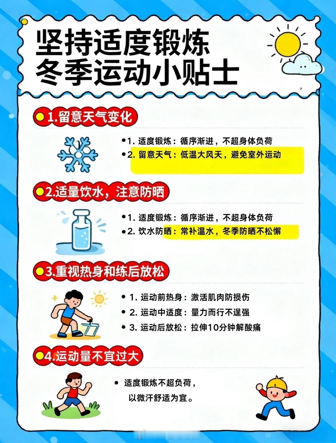 不想越躺越虚?冬季运动记住这4点:低温大风天别出门,室内动一动就好;运动前一定要热身(激活肌肉防拉伤);别追求大汗淋漓,微汗舒适就够;练完记得拉伸10分钟,缓解酸痛还能助眠~最后提醒:冬春季是呼吸道传染病高发期,勤洗手、常通风、少扎堆,不舒服及时休息就医~这个冬天,既要暖乎乎,也要健健康康呀~