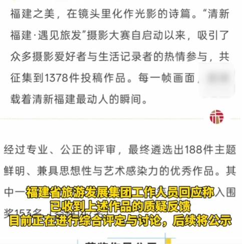 摄影大赛翻车现场!白纸黑字禁 AI,一等奖作品却被锤是算法拼接,这脸打得啪啪响! 12 月 18 日,福建旅发集团 “清新福建・遇见旅发” 摄影大赛公示获奖名单,周某某的《湖秋雾影》拿下一等奖,获 1000 元奖金和文旅卡。 可公示后质疑声炸了,专业摄影家放大作品一看,全是 AI 生成的破绽:建筑边缘歪歪扭扭、窗户轮廓变形,墙上六个文字清晰却认不出,树叶过渡太均匀,没有真实照片的光影细节。 要知道,大赛明确要求作品原创真实,严禁 AI 生成、合成换图,还得填写准确拍摄地点。12 月 29 日,主办方回应正在核查,将公布结果。记者联系省手机摄影协会,负责人称作者是老年大学爱好者,平时爱实景拍摄,但不确定这张是不是他的。 真实摄影师扛着设备、守着光线拍大片,转头输给 AI 拼接的 “完美画面”,太寒心。赛事标榜专业公正,却让疑似 AI 作品拿一等奖,评审漏洞一目了然。 摄影的魂是真实,不是算法的套路。