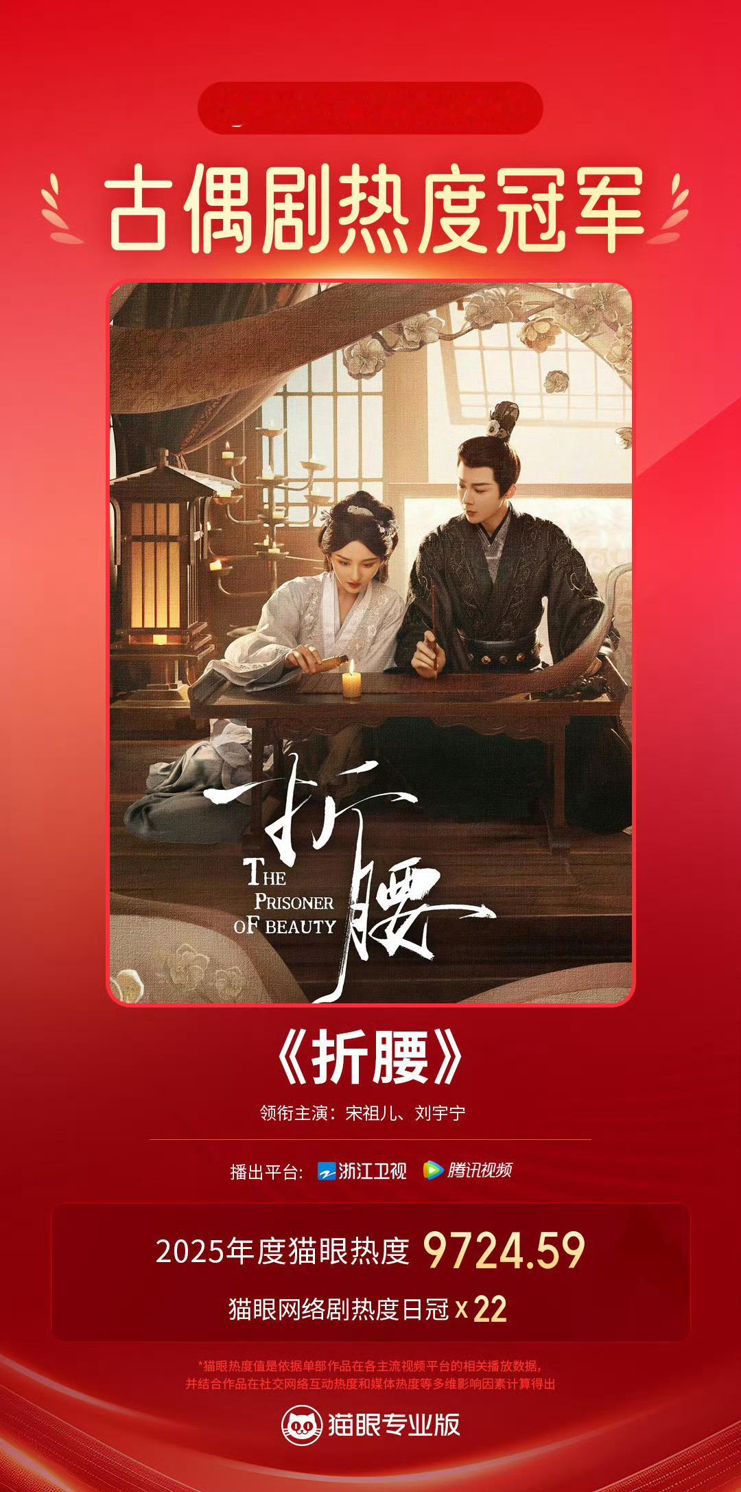折腰年度最热古偶剧折腰年度日冠次数最多网络剧刘宇宁主演的《折腰》,是猫眼古偶类型年冠,日冠次数最多的剧集。这部剧没有太多营销,全靠演员剧情带飞,在全类题材里,含金量更高。