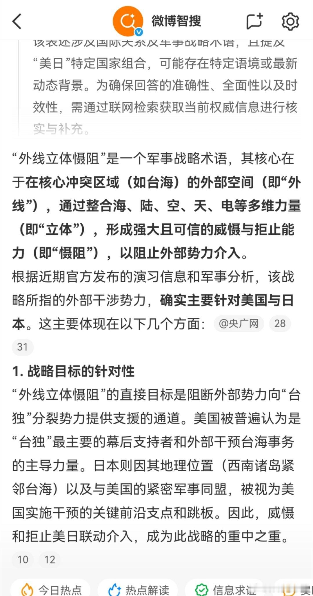 东部战区发布联合演训区示意图“外线立体慑阻”是一个军事战略术语,其核心在于在核心冲突区域(如台海)的外部空间(即“外线”),通过整合海、陆、空、天、电等多维力量(即“立体”),形成强大且可信的威慑与拒止能力(即“慑阻”),以阻止外部势力介入。根据近期官方发布的演习信息和军事分析,该战略所指的外部干涉势力,确实主要针对美国与日本。这主要体现在以下几个方面: