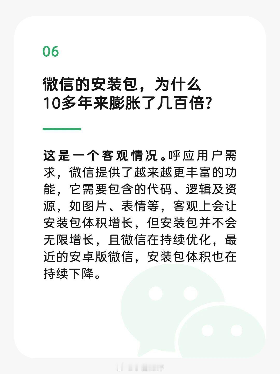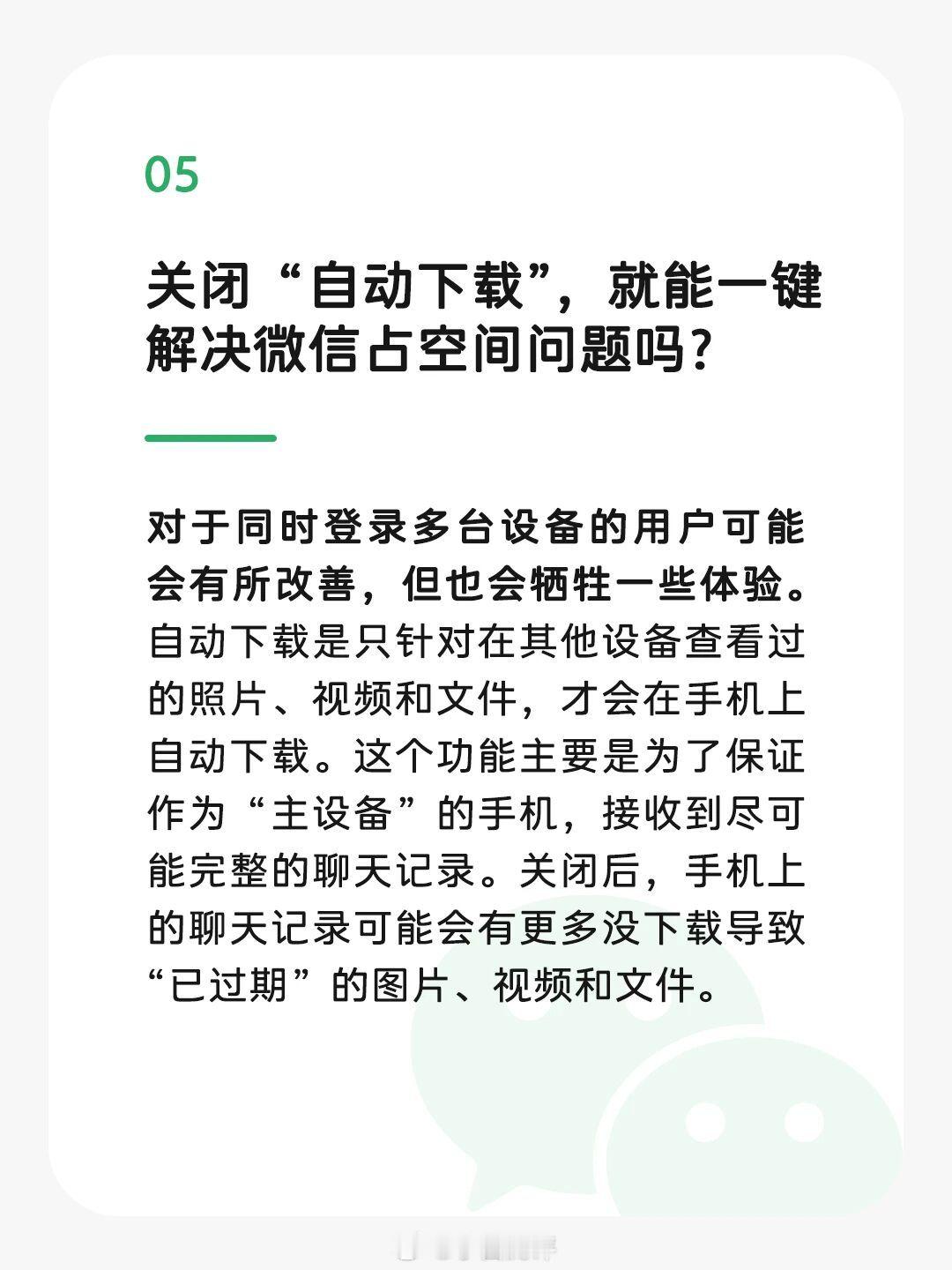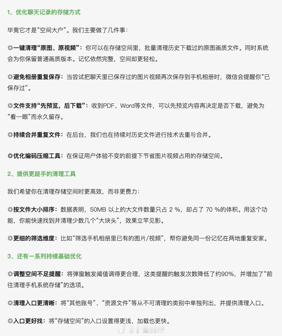 微信回应占储存空间8个误解 微信回应了几个关于存储空间的问题,里面有个数据有点意思:「当手机存储空间剩余700MB(iOS)或最高1GB(Android)时微信会弹窗提醒空间不足」;另外「微信占用空间在40GB以上的用户,聊天记录平均占比达70%」。大家有触发过手机空间不足的弹窗吗?